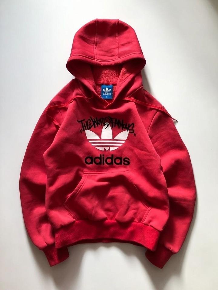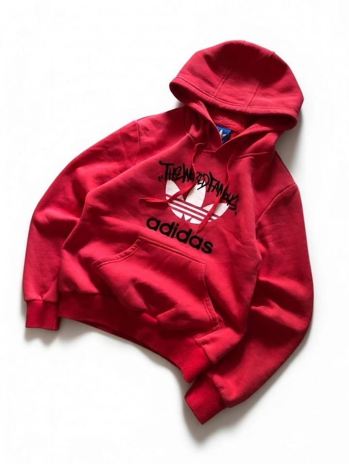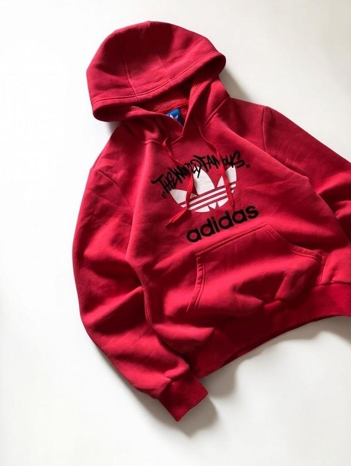 Adidas худи (ярко-красный, флис внутри, принт "THE WORLD FAMOUS" с логотипом Adidas). Размер С. Состояние идеальное — без катышков, пятен, затяжек, всё как новое. Цена: 12 000 тенге. Крутой стрит-стайл в отличном состоянии! Артикул: 485896