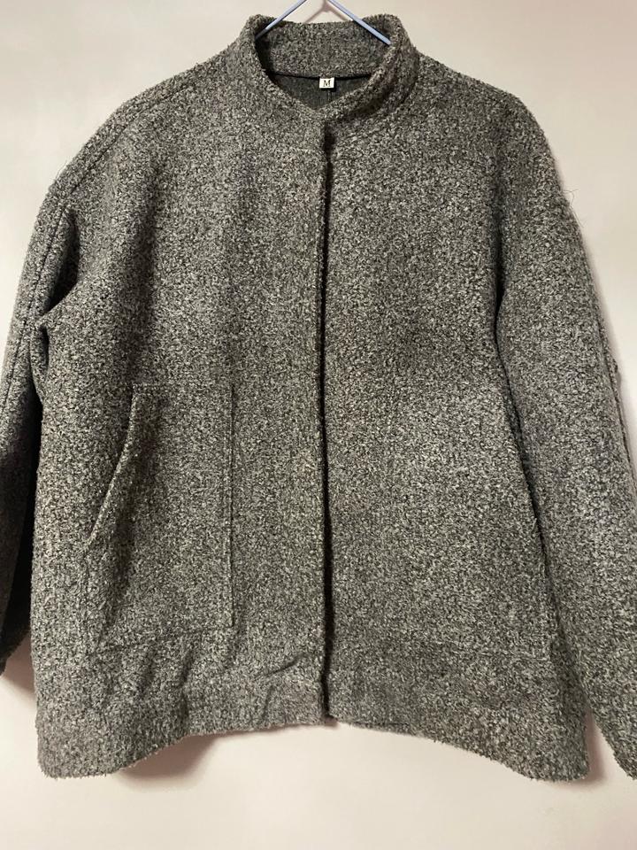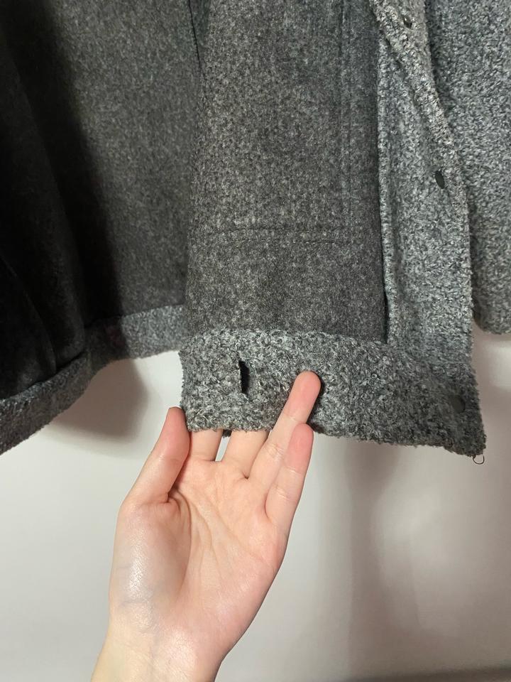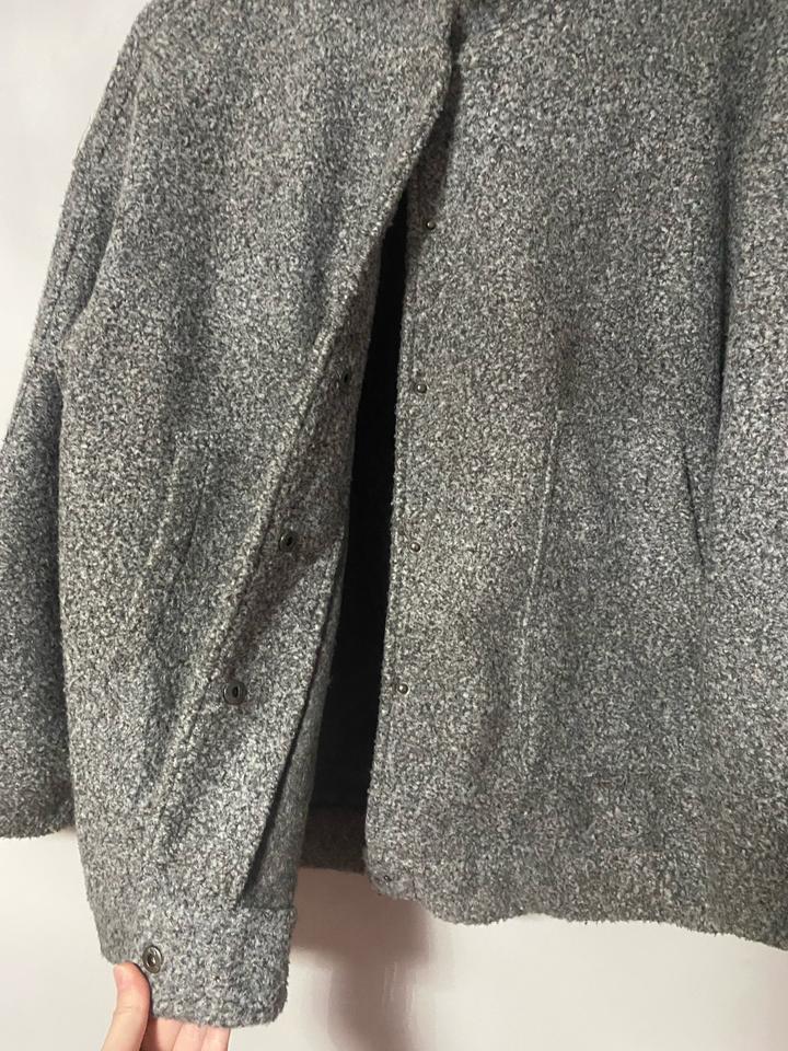 серый бомбер на кнопках, карманы рабочие , рукава укорочены , есть дефекты (на фотографии видно ) Артикул: 486149
