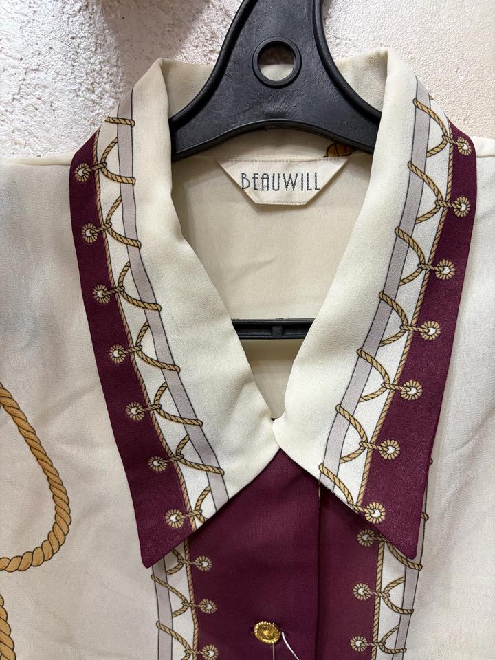 Элегантная рубашка из лёгкой гладкой ткани с морским принтом. Контрастная центральная планка и воротник глубокого бордового оттенка, золотистые пуговицы, тонкий декоративный кант. Артикул: 486276