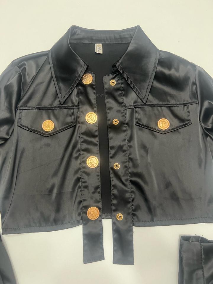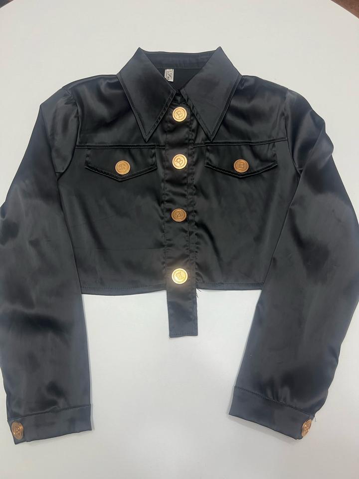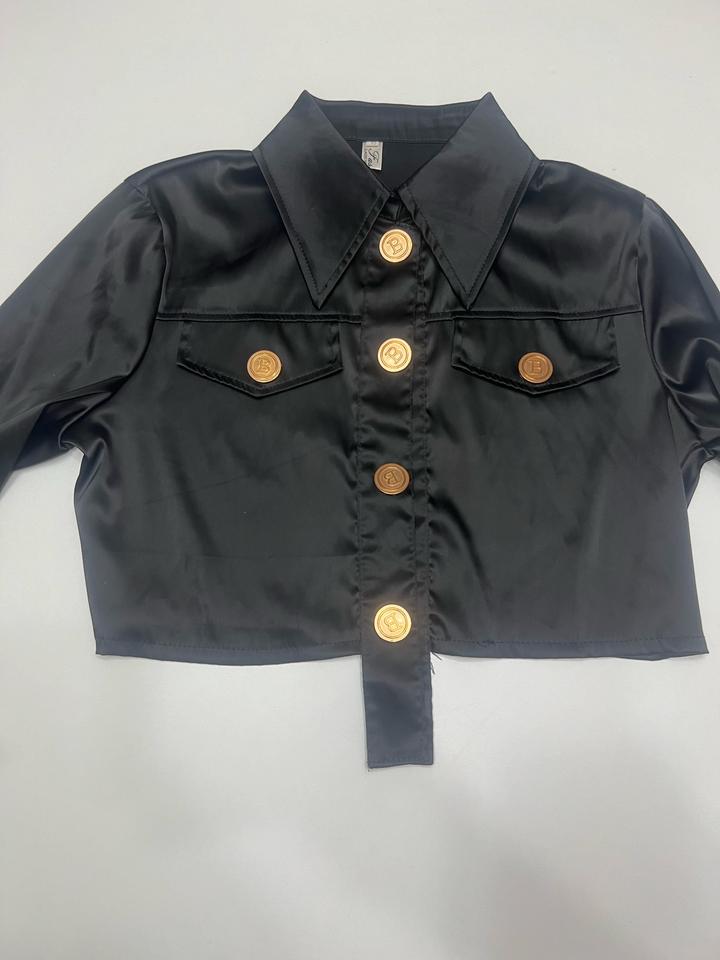 Укороченная глянцевая рубашка. Золотые декоративные пуговицы. Очень стильная, в стиле Balmain. Артикул: 486447