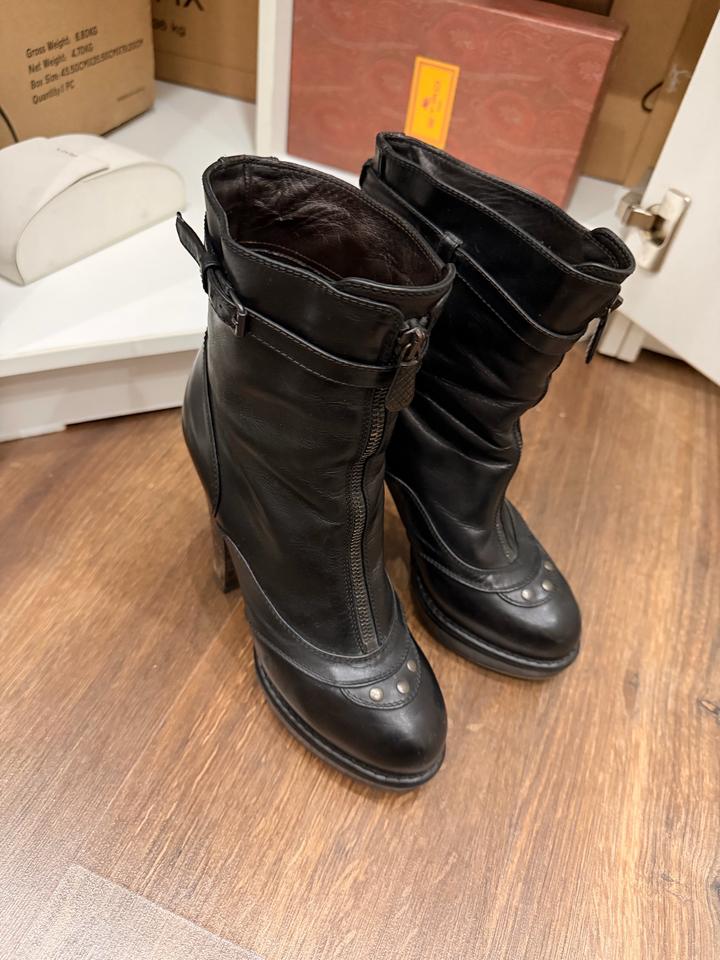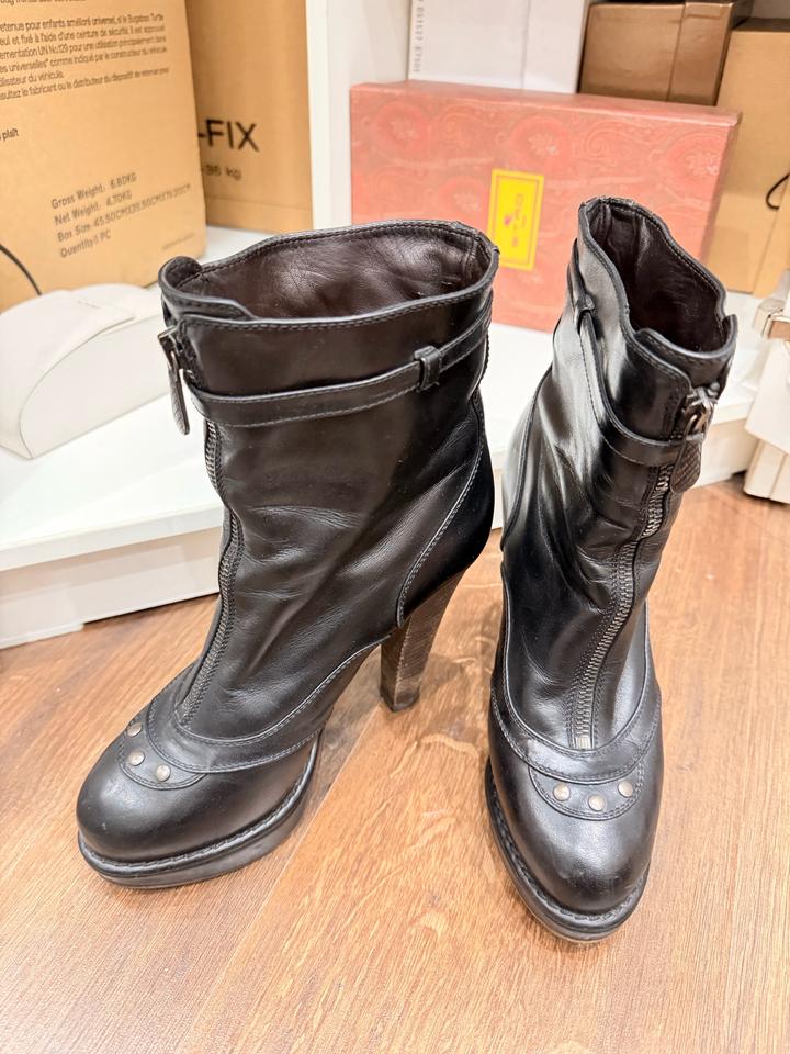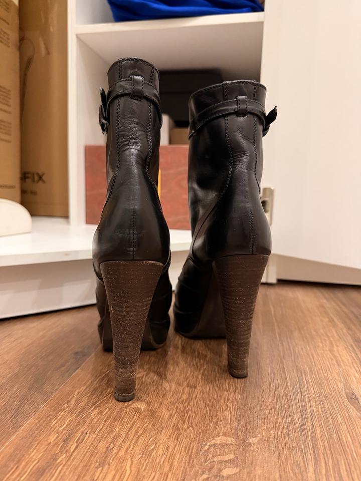 Ботильоны из черной кожи, платформа и каблук. Б/у, на каблуках следы носки, есть мелкие царапины по коже, цена с учетом повреждений. Оригинал. Артикул: 486640