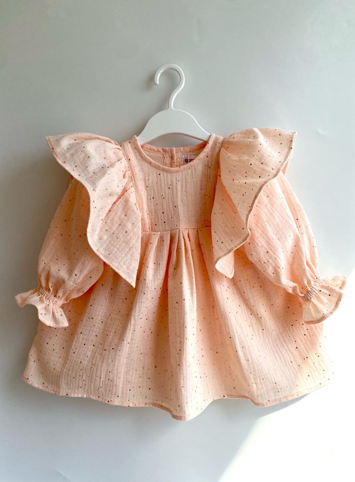 Ткань: муслин персикового цвета с золотистой россыпью Размер: ростовка 86-92-98 (1-2-3 года) Застежка на бамбуковых пуговицах на спинке Новый с этикеткой Стоимость 9.990 тенге Артикул: 486707
