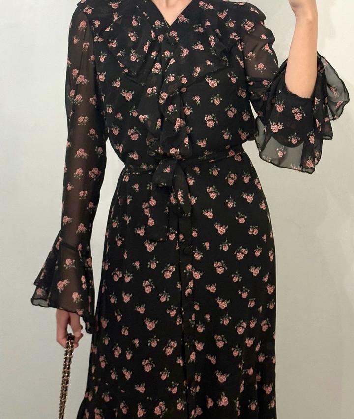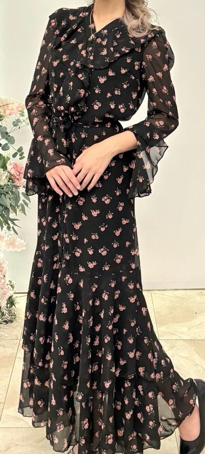 Чёрное платье с розовыми цветами, с поясом. Надето всего один раз, состояние отличное. Артикул: 487093