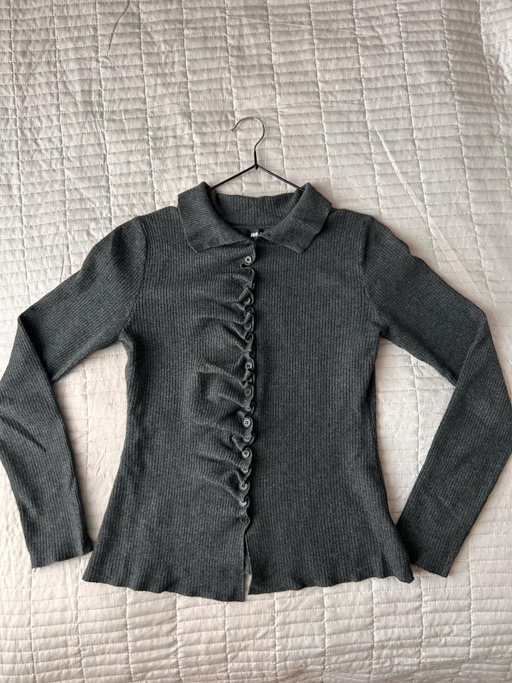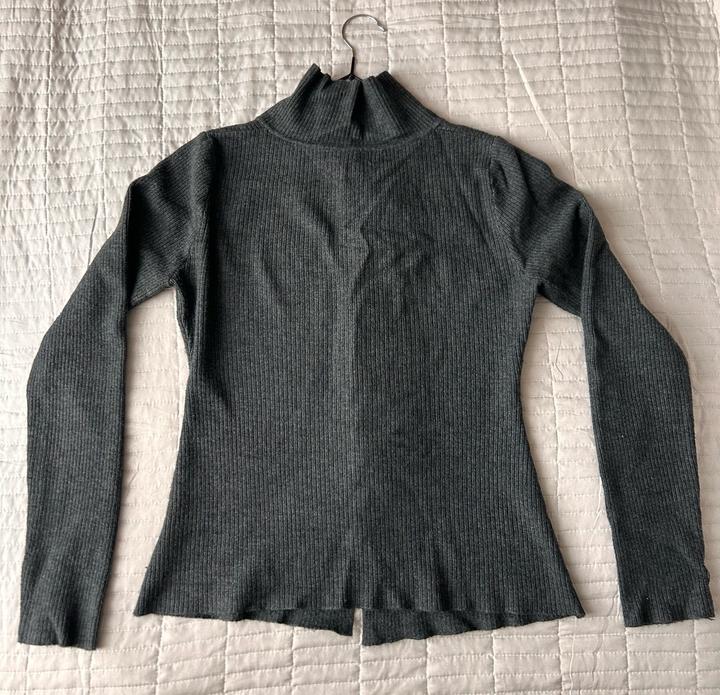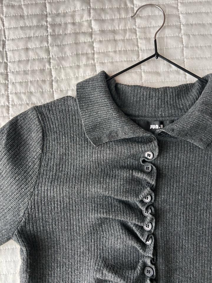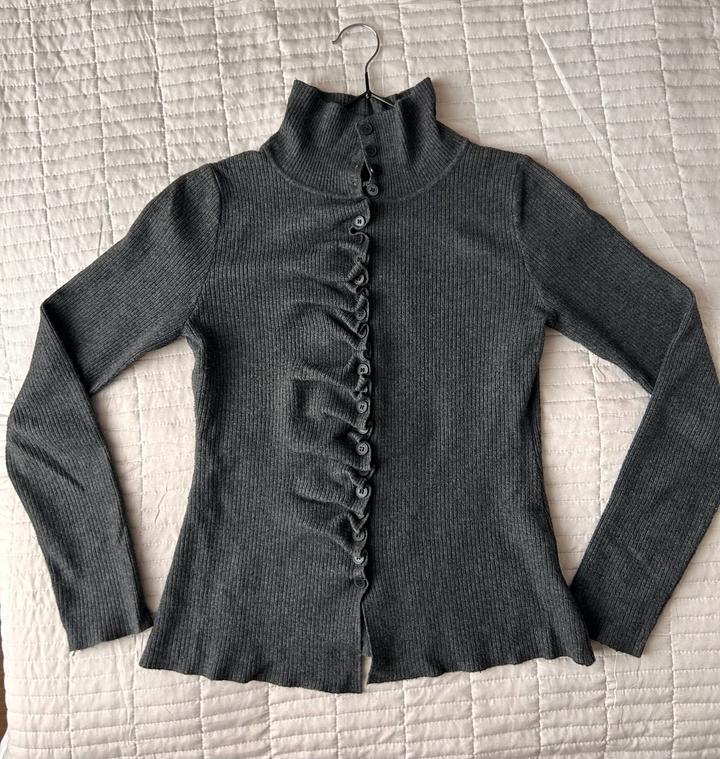 трикотажный кардиган (свитер) в рубчик с высоким воротником и декоративными складками (сборками) вдоль планки с пуговицами. Артикул: 487235