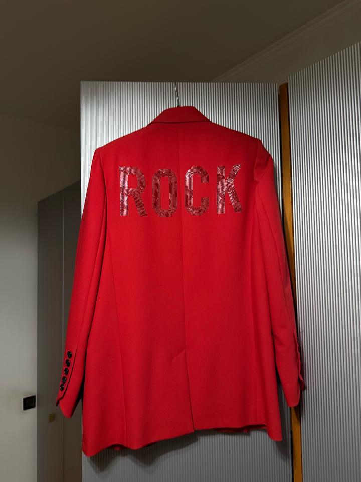 Красный пиджак, носился 1 раз. Размер С, оверсайз. На спине есть надпись ROCK. Артикул: 487427