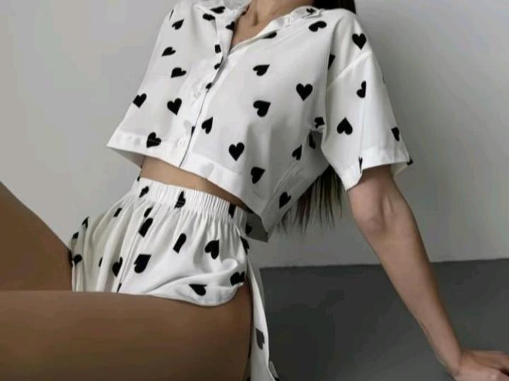 Это комплект из двух предметов — короткая рубашка-топ с пуговицами и лёгкие шорты. Цвет — белый с крупным принтом чёрных сердечек по всей поверхности. Ткань выглядит гладкой и слегка блестящей, похоже на сатин/микрофибру — мягкая и приятная к телу. Топ — свободный, с короткими рукавами и укороченной длиной (ближе к кроп-варианту). Шорты — на широкой эластичной резинке, свободного кроя, короткие и с глубокими боковыми разрезами, что делает их более воздушными. Впечатление: игривая, минималистична Артикул: 487925