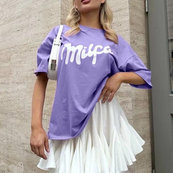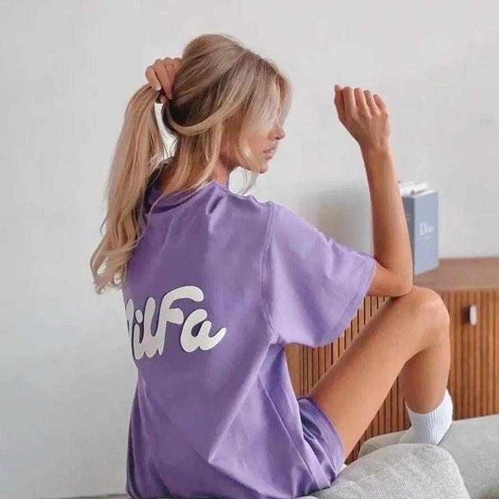 Яркая и модная футболка свободного кроя, которая станет акцентом любого образа. Нежный лавандовый цвет и стильный принт Milfa делают модель трендовой и заметной. Особенности: • модный крой oversize • мягкая, приятная к телу ткань • стильный крупный принт спереди и сзади • универсальная длина — можно носить как футболку или мини-платье • трендовый лавандовый цвет Отлично сочетается с юбками, шортами, джинсами или лосинами. Подходит для повседневных, спортивных и street-style образов. ✨ Артикул: 488076