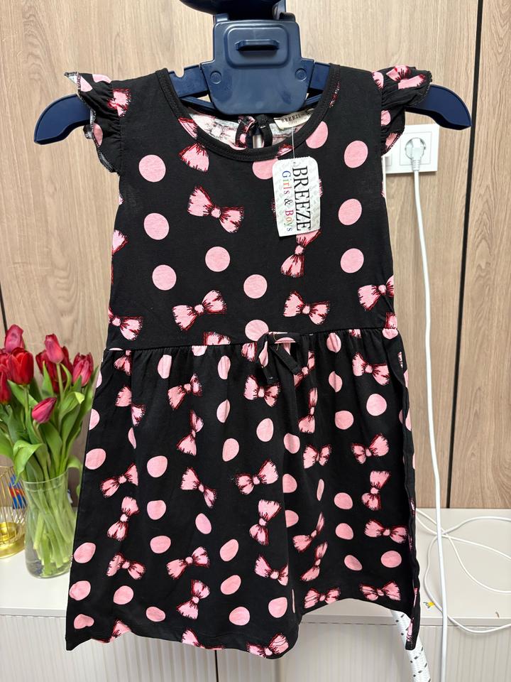Милое хлопковое платье. Сзади на пуговичке. Написано, что на рост 128 см, но выглядит будто бы меньше. Если ребенок пухленький, можно смело и на меньшего роста брать. Артикул: 488136