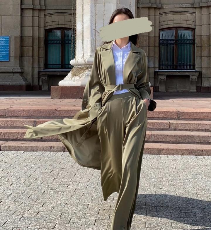 Осенняя двойка. Брюки на резинке. Размер стандарт. Цвет хаки. Покупала за 35 тыс тг. Надевала 1 раз. Продаю за 20 тыс тг. Состояние идеальное как новое. Артикул: 488192