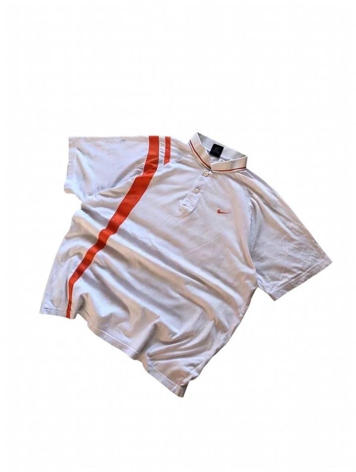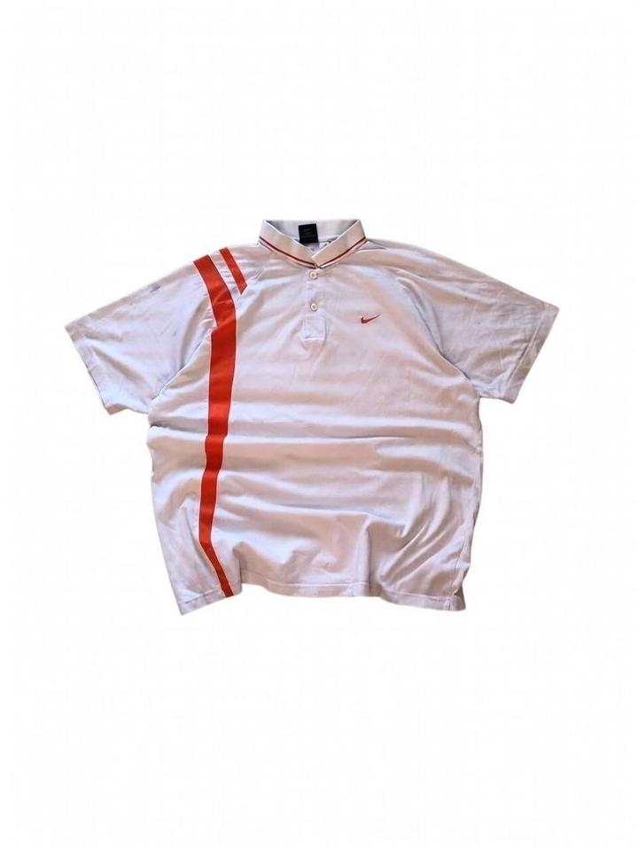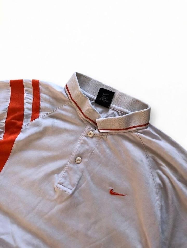 Классическая поло Nike белого цвета с яркой оранжевой полосой по боку, короткий рукав, воротник с красной окантовкой. Размер L/XL (оверсайз, свободный крой), состояние хорошее — без заметных дефектов, чистая и ухоженная. Логотип Nike на груди, удобная для повседневки или спорта. Цена: 7500 тенге. Артикул: 488631