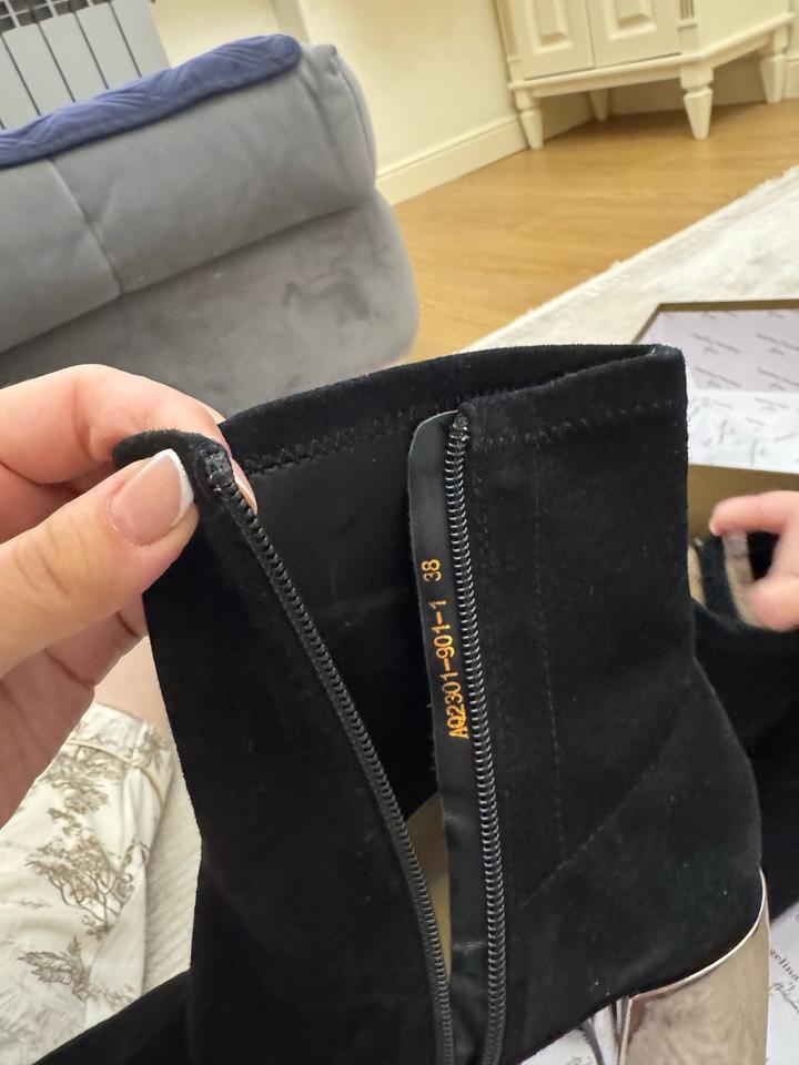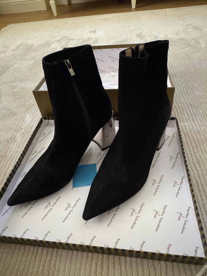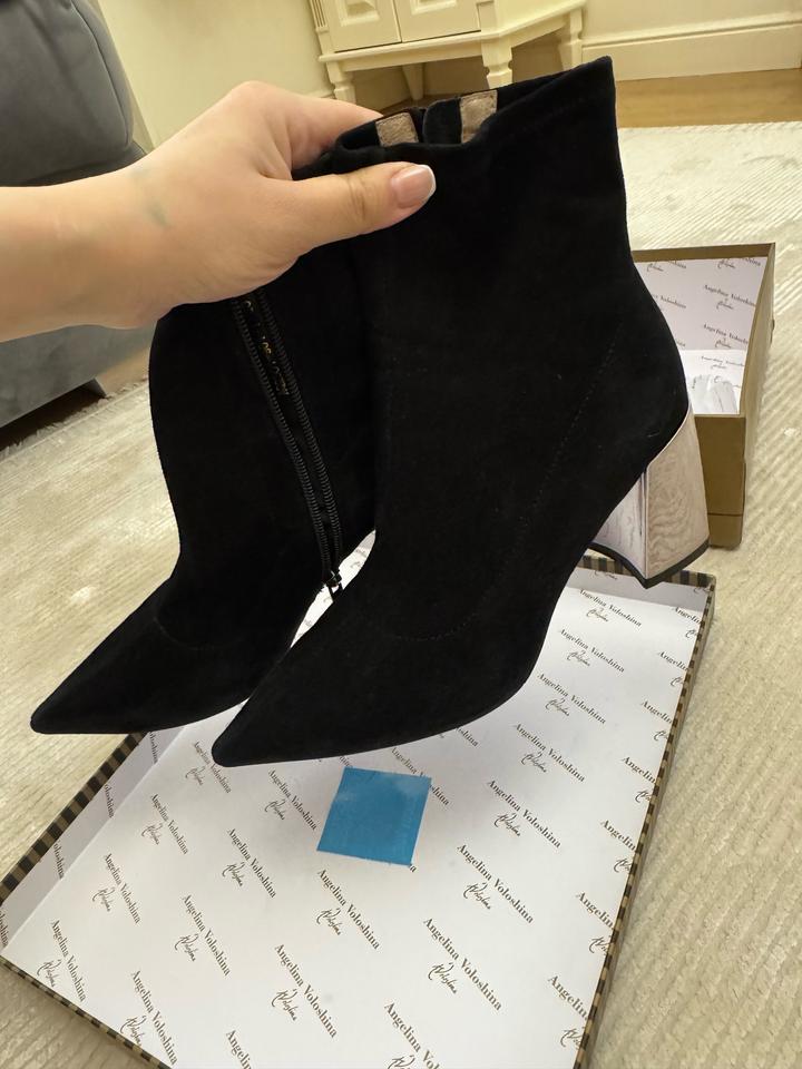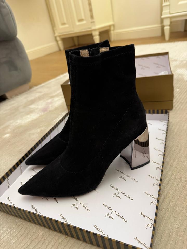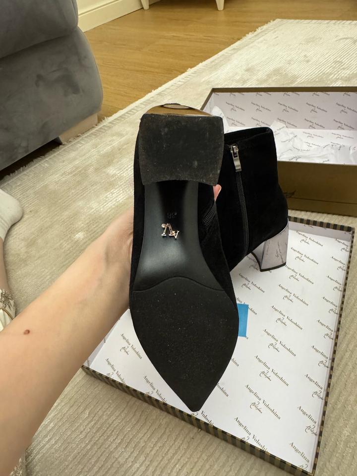 Ботильоны Angelina Voloshina 🖤 Элегантные чёрные ботильоны из мягкого бархатного материала. Стильная модель с острым носом и необычным зеркальным каблуком — смотрятся очень эффектно и дорого. ✨ Бренд: Angelina Voloshina ✨ Цвет: чёрный ✨ Каблук: устойчивый, зеркальный ✨ Носок: острый ✨ Состояние: почти новое, одевали 1 раз ✨ В комплекте: фирменная коробка Идеально подойдут как для вечернего образа, так и для стильных повседневных луков. Это оригинал, приложение не дает добавить этот пункт. Артикул: 490445