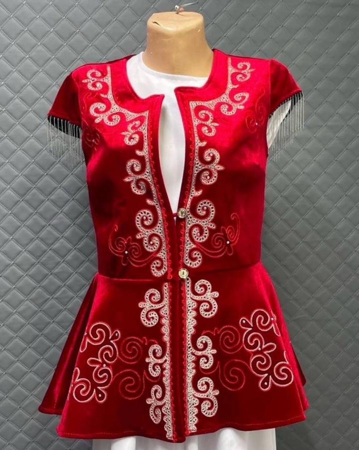 в традиционном стиле и отлично подойдет для праздничных мероприятий, таких как Наурыз, Грудь, подол и края украшены белой вышивкой с использованием классических казахских орнаментов («қошқар мүйіз» и растительные мотивы). • По краям коротких рукавов добавлена бахрома из бисера, что придает образу динамику и изящество. Артикул: 491510