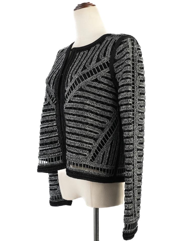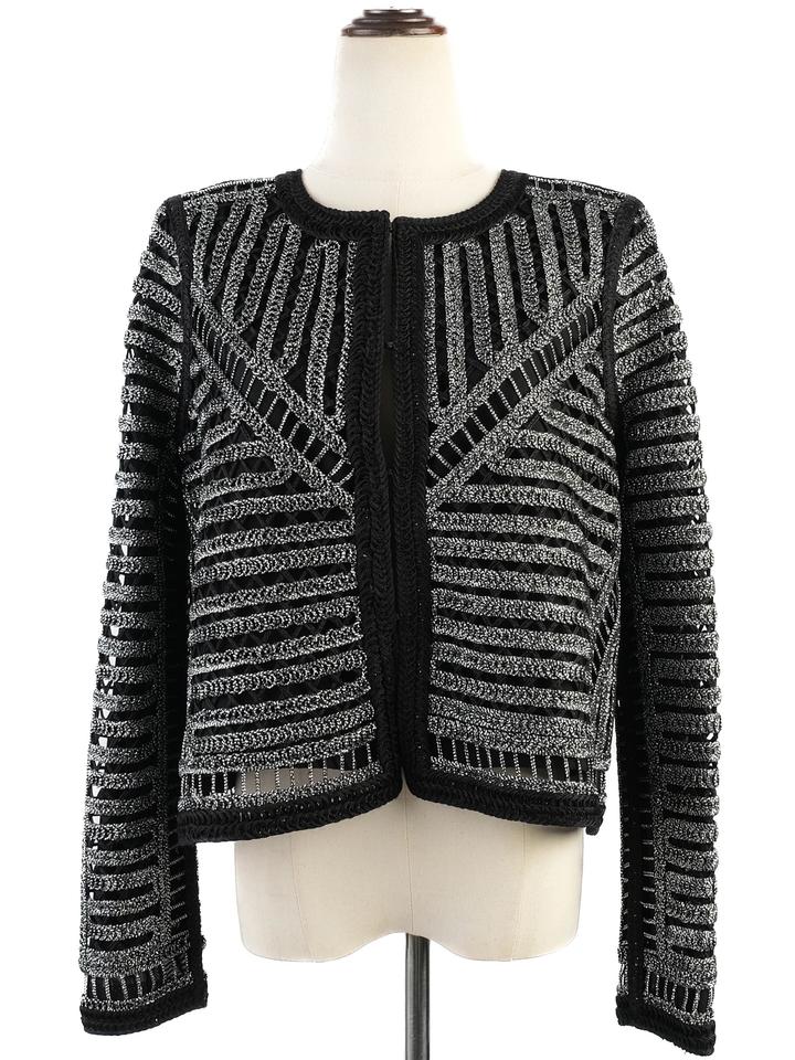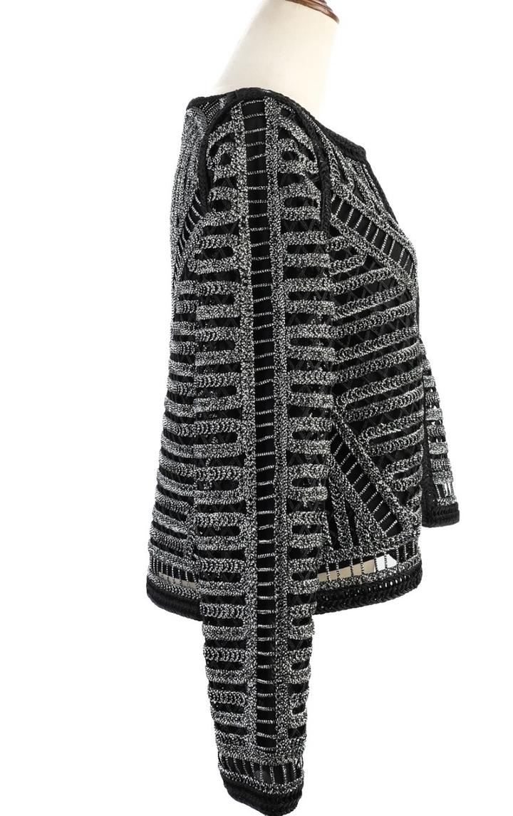 Стильный укороченный жакет премиального французского бренда Maje. Модель с эффектной серебристой вышивкой и фактурным узором. Отлично держит форму и красиво смотрится как с джинсами, так и с платьем. — Оригинал — Укороченный крой — Декоративная вышивка и текстурный узор — Цвет: чёрный с серебром — Лёгкий и эффектный акцент в образе Состояние: отличное Артикул: 491996