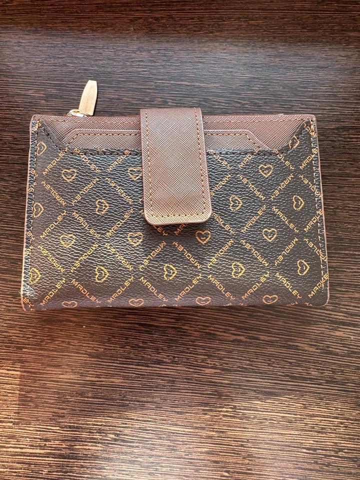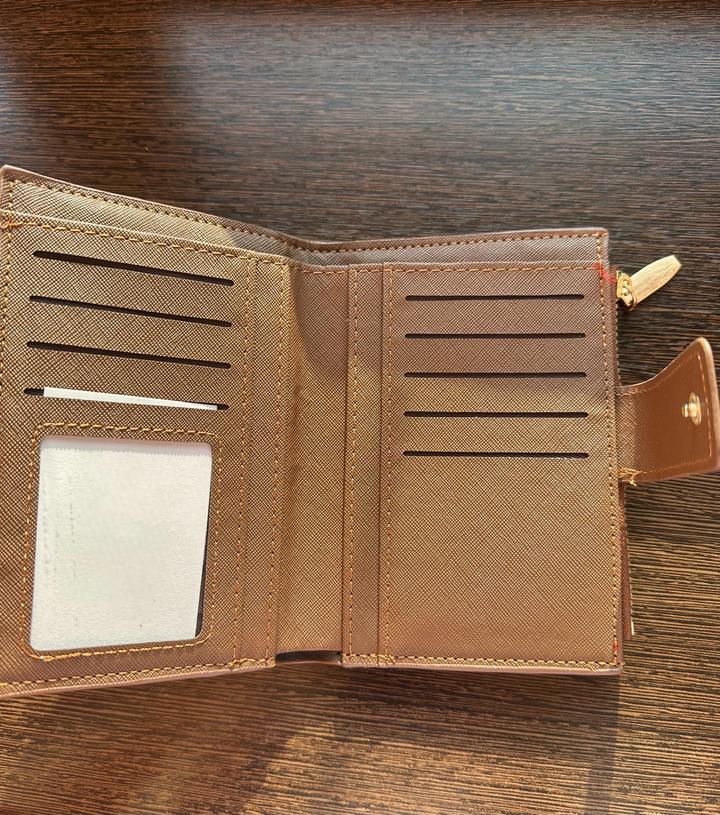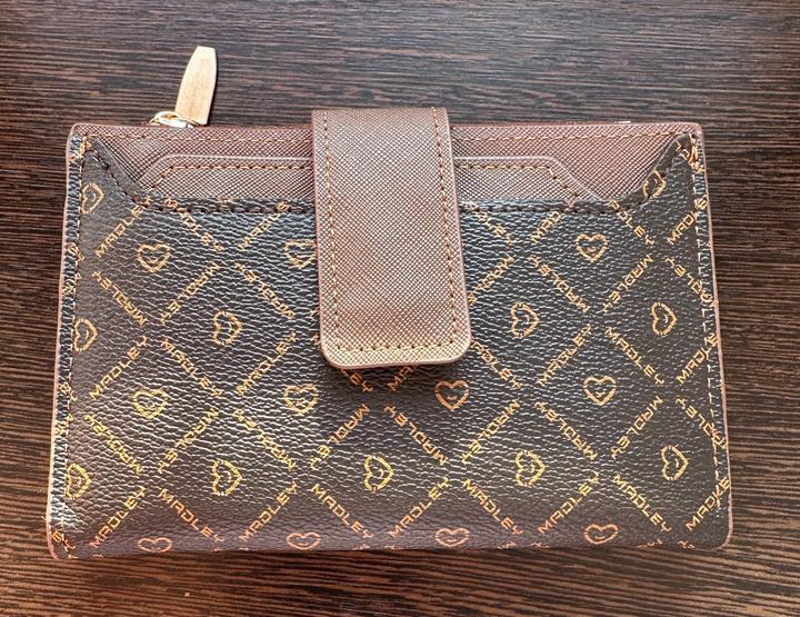 Кошелек смешанного цвета коричнево черный, с интересным узором. Очень удобный, есть отделение для карточек, наличных денег и мелочи, а также впереди под заклепкой дополнительное отделение для карточки. Очень стильный и выдержанный, кож.зам, новый, отличного качества, производство Пекин. Есть его родной мешочек. Все прошито качественно, все строчки. Артикул: 492879