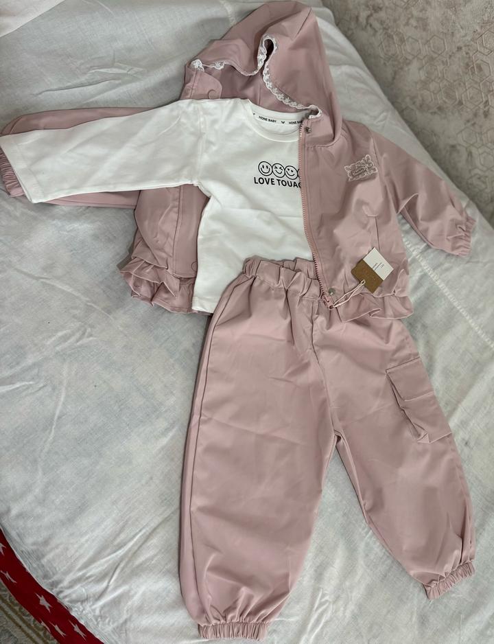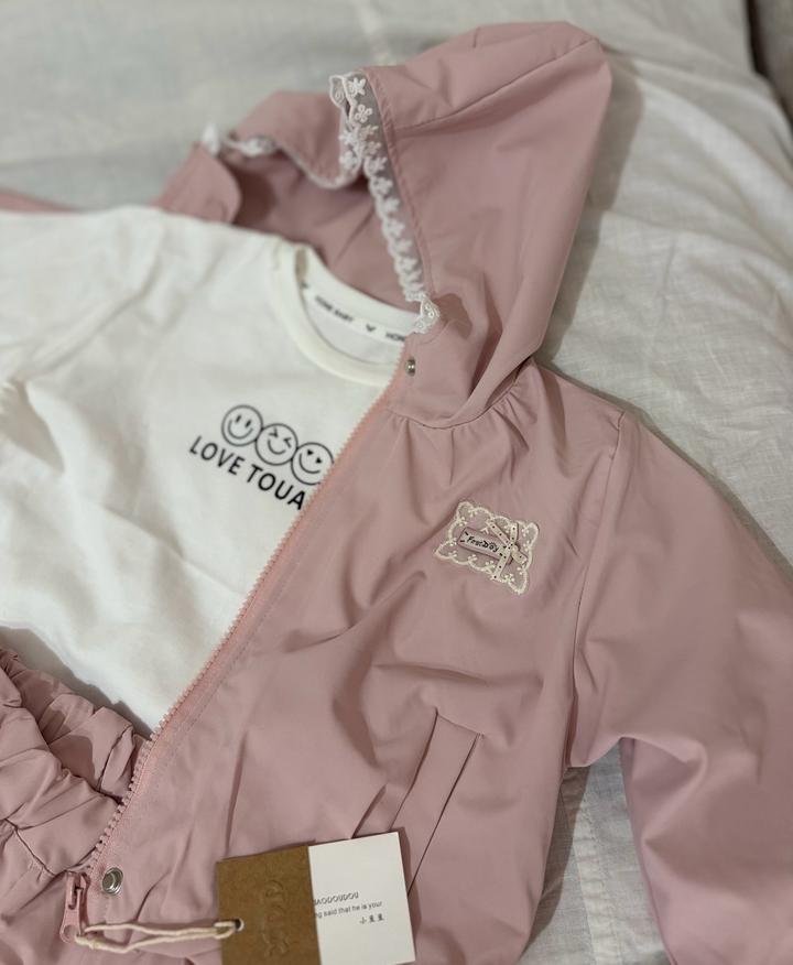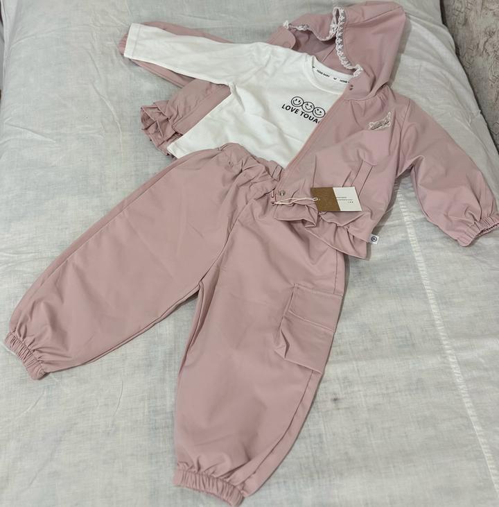 Детский демисезонный костюм-тройка в нежно-розовом и белом цветах. В комплект входят куртка-ветровка с капюшоном, лонгслив (футболка с длинным рукавом) и брюки-карго. Артикул: 493000