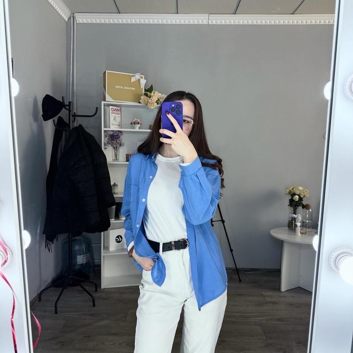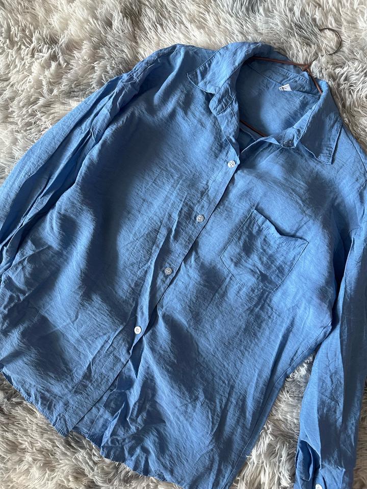 Синяя рубашка классического кроя, с небольшим нагрудным карманом. Рубашка свободного кроя, ткань легкая. Артикул: 493070
