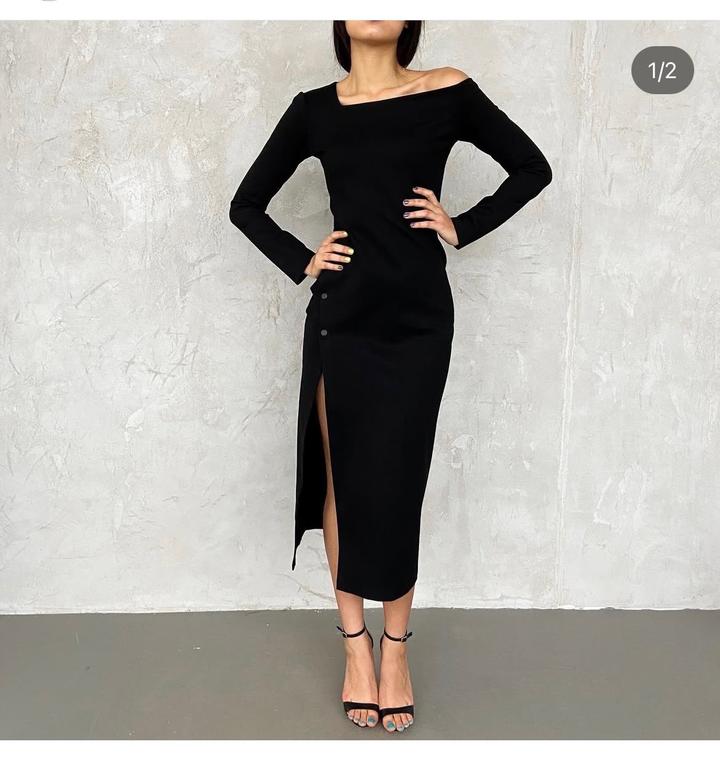 Черное платье миди Avtor Designs из итальянского трикотажа. Элегантный приталенный крой, отлично подчерктвает талию. Регулирующийся разрез на кнопках. Артикул: 493194