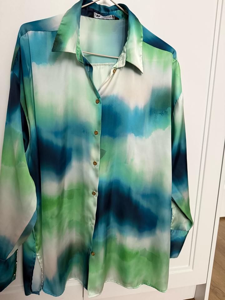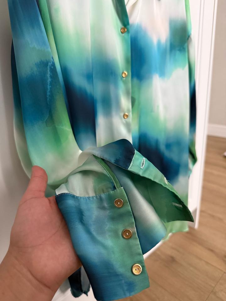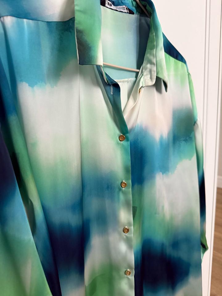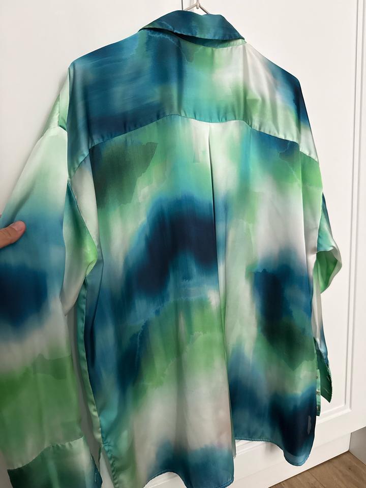 Блузка разноцветная преимущественно в сине-зеленных оттенках из полиэстера, пуговицы золотистые, крой свободный, ткань легкая и приятная. Артикул: 493865