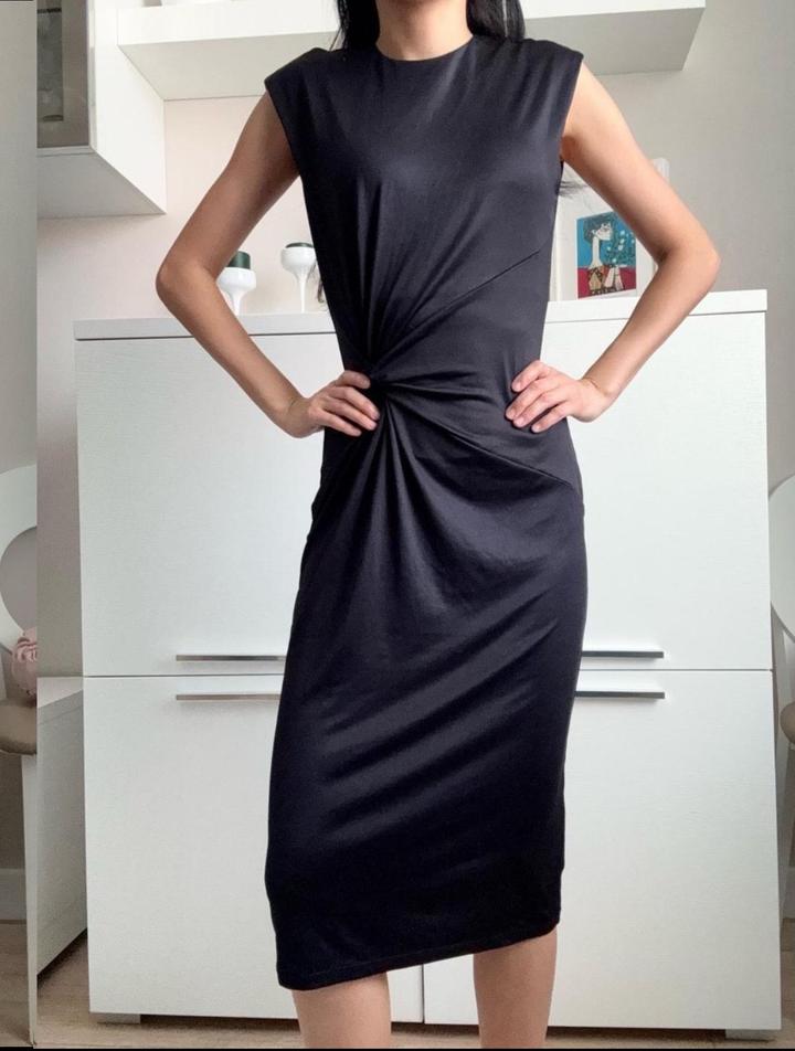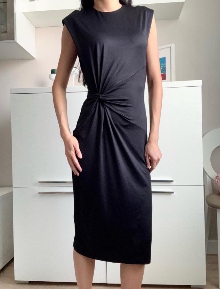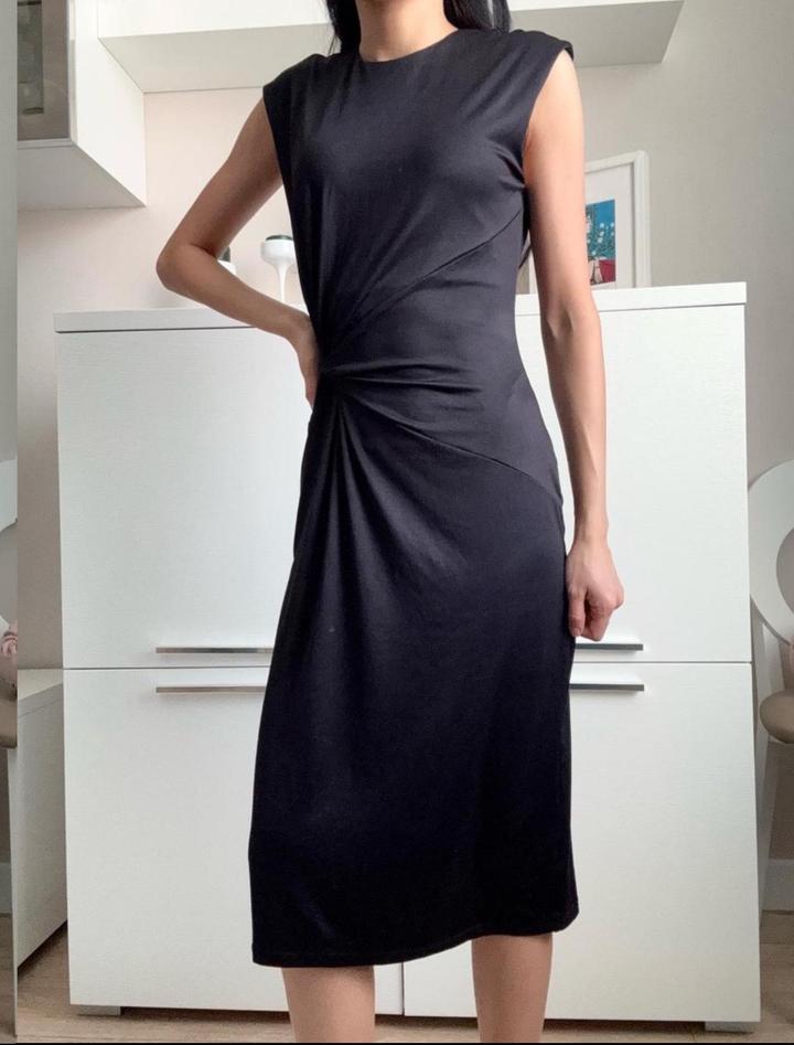 Элегантное платье миди чёрного цвета с асимметричной драпировкой в области талии, которая красиво подчёркивает фигуру и создаёт утончённый силуэт. Артикул: 494930