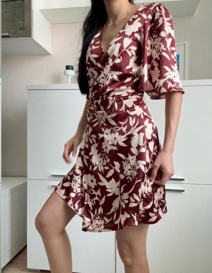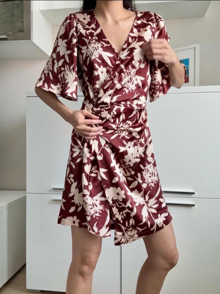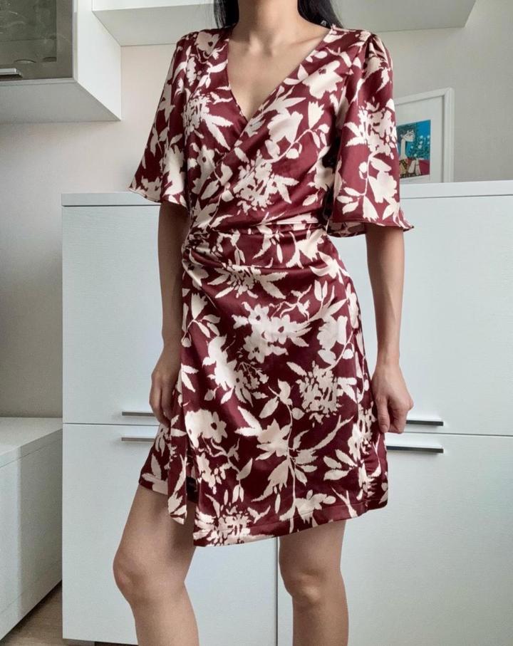 Лёгкое платье с цветочным принтом в бордово-кремовой цветовой гамме. Запах и V-образный вырез и свободные рукава. Артикул: 494969
