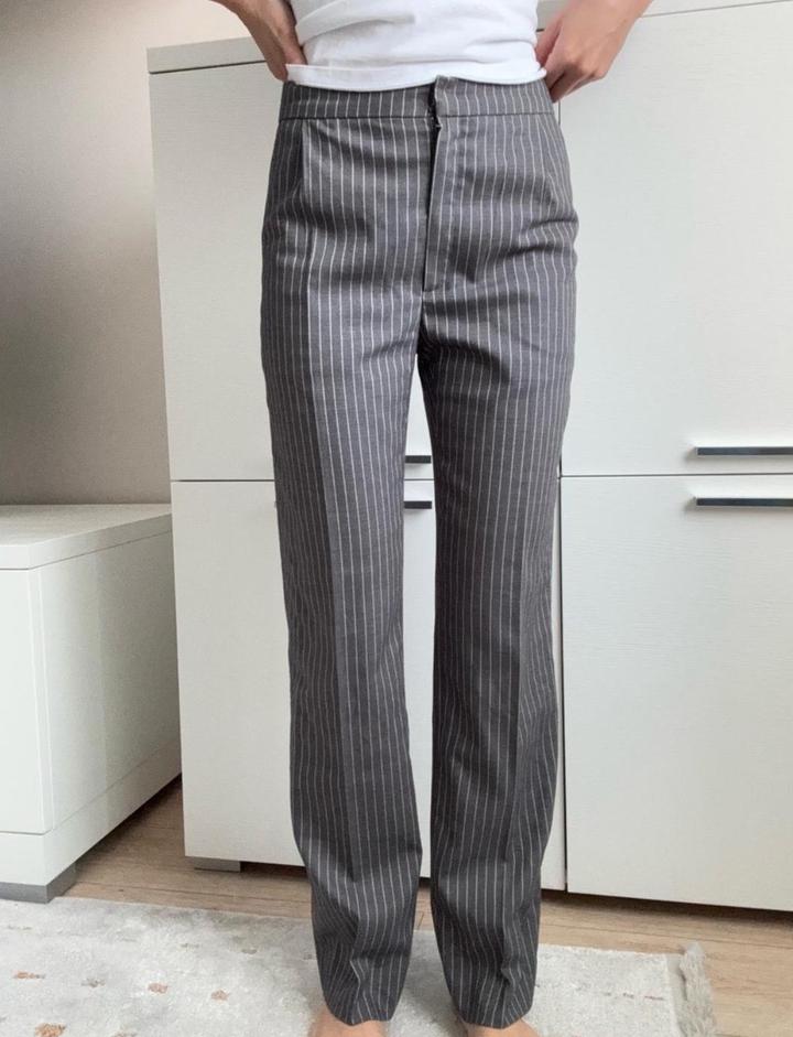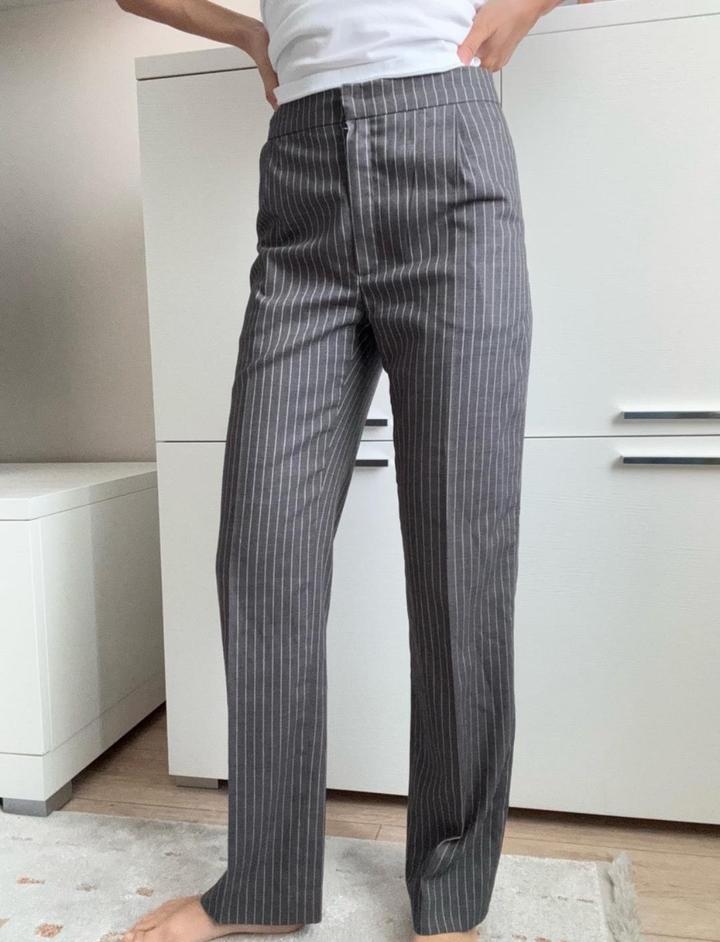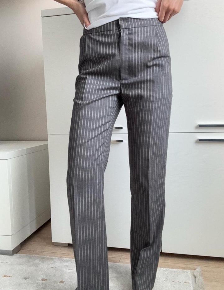 Классические прямые брюки в тонкую вертикальную полоску с высокой посадкой, подчёркивающей талию и визуально вытягивающей силуэт. К нему есть пиджак. Рост 161 см. Артикул: 494974