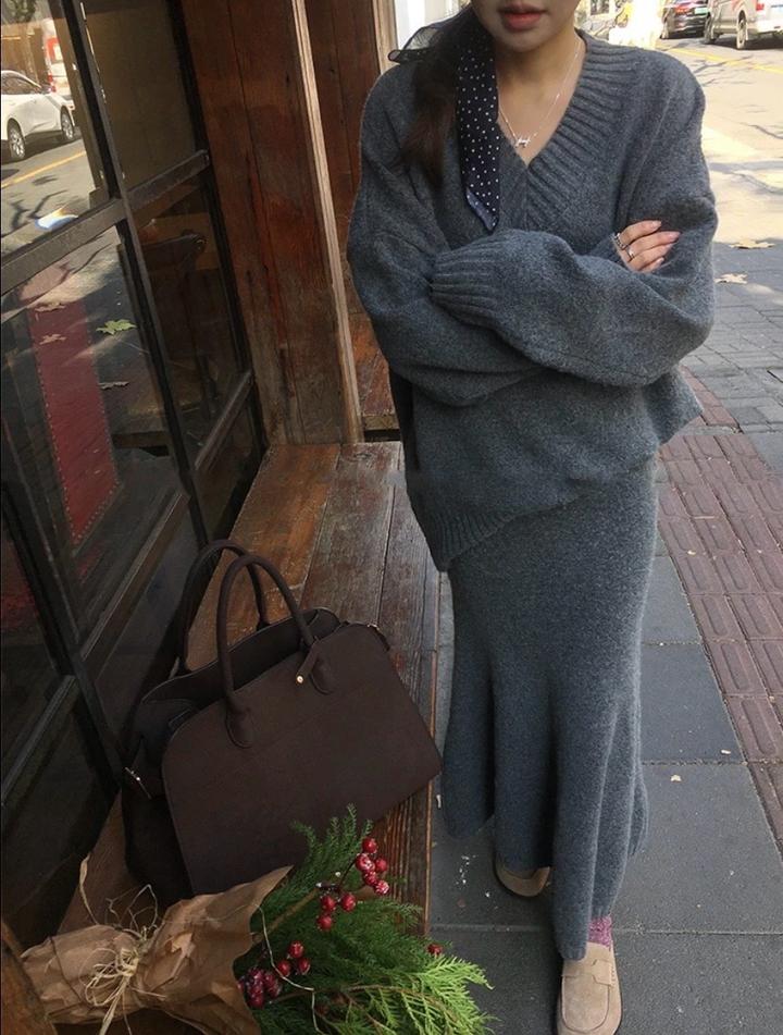 Стильный трикотажный костюм: свободный свитер с V-вырезом и длинная юбка. Мягкий материал, комфортная посадка и минималистичный корейский стиль. Подходит для повседневных образов и прохладной погоды. Артикул: 496762