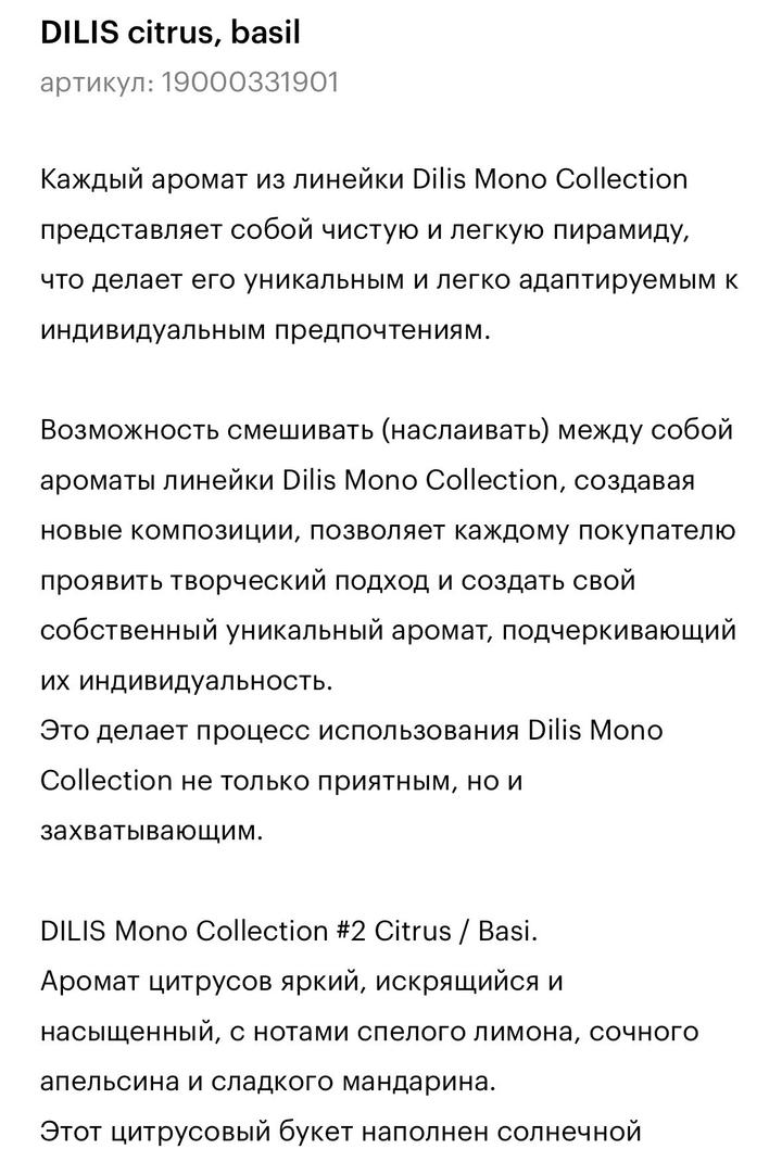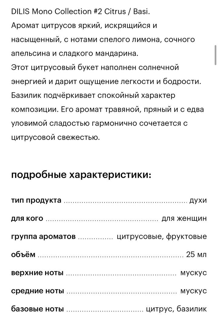 Духи DILIS citrus, basil Базовые ноты цитрус и базилик, верхние и средние ноты мускус Легкий свежий аромат Упаковка вскрытая, использовали 1 раз. Покупала в золотом яблоке Артикул: 496892