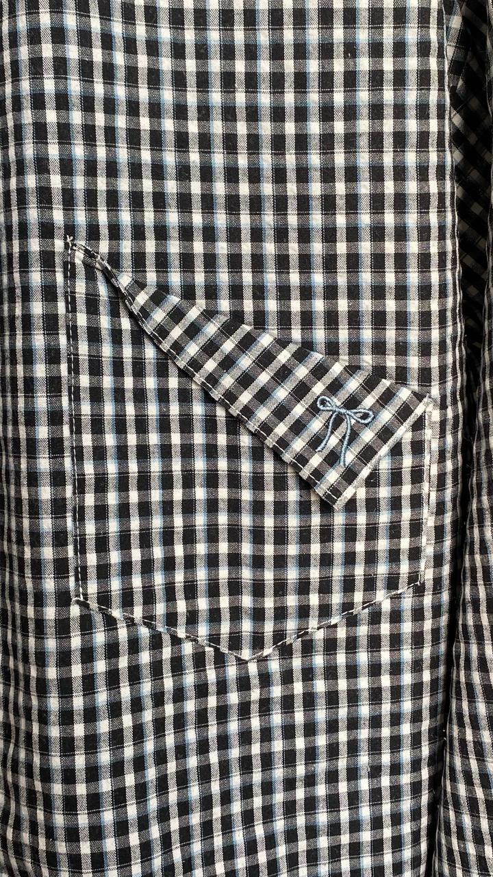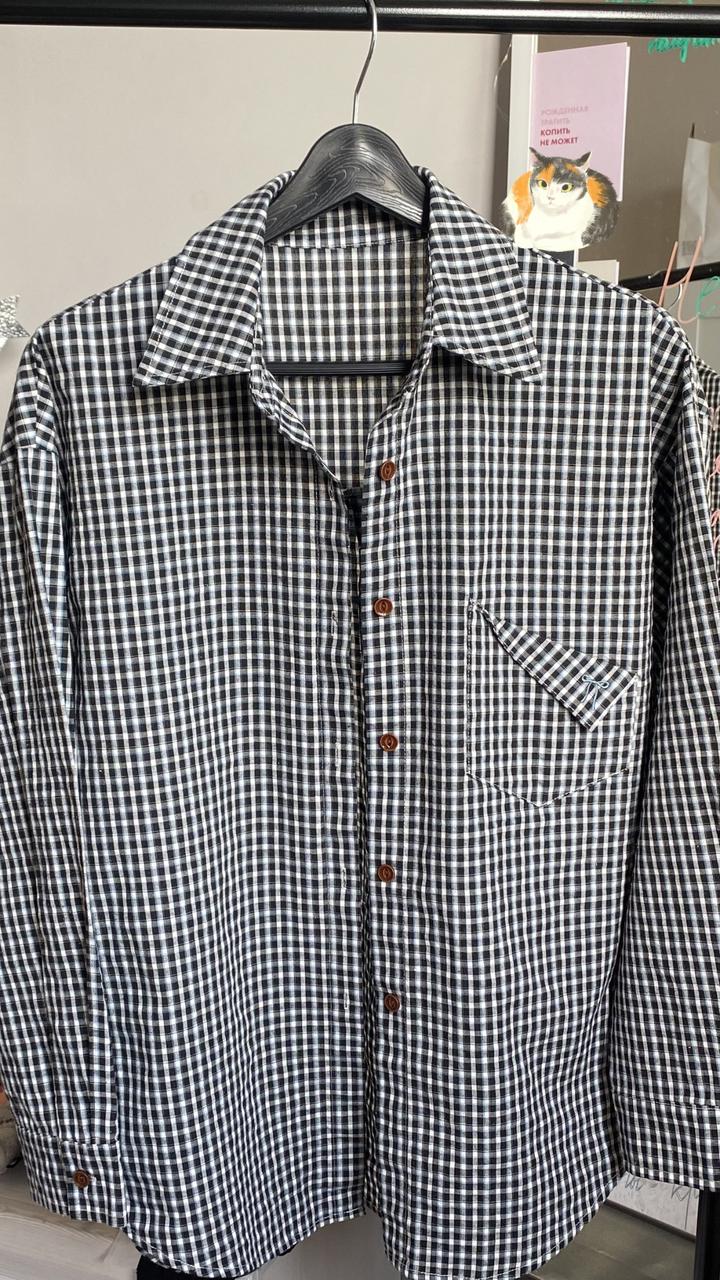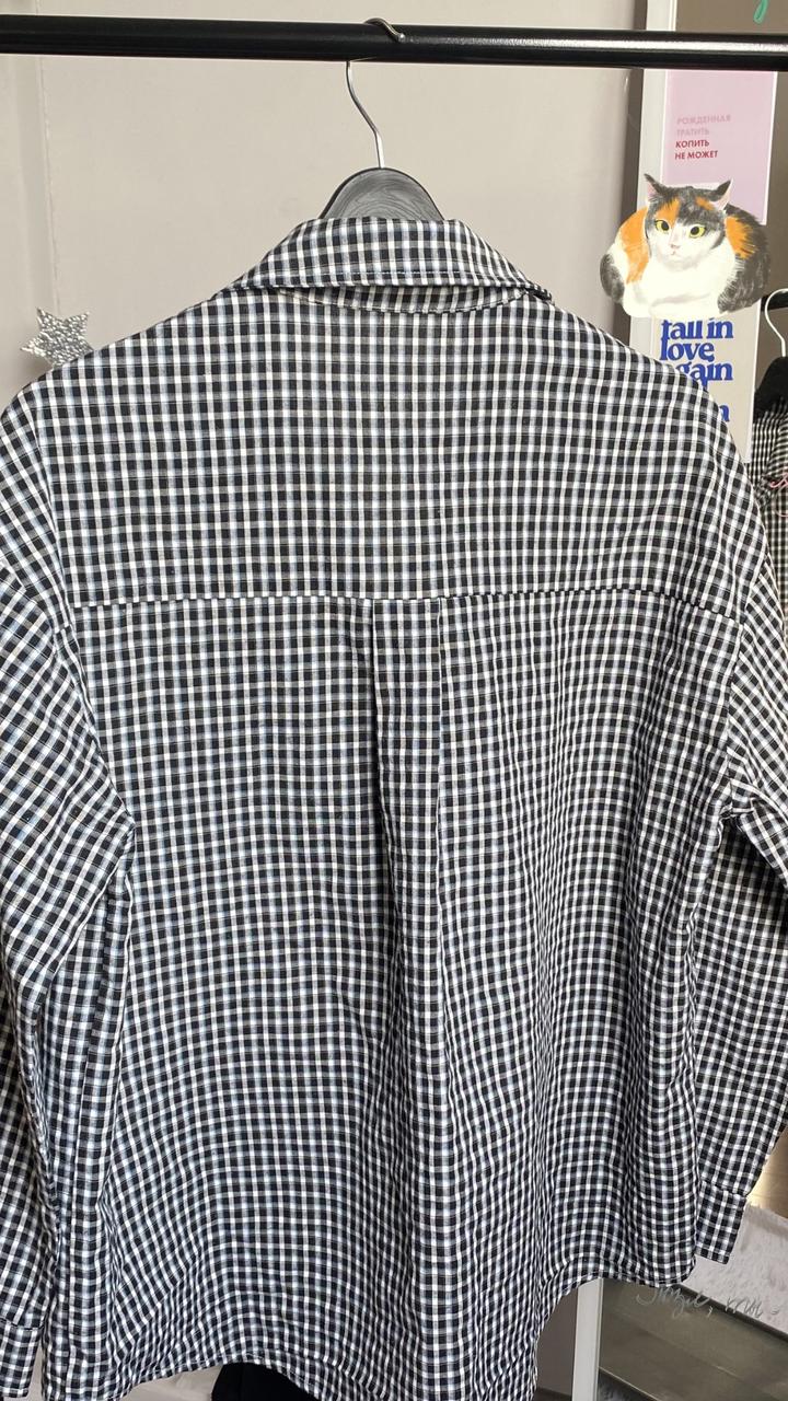 Рубашка в черно-бело-синию клетку. Есть милый бантик на кармашке, сидит свободно, но ткань достаточно плотная! Артикул: 497058