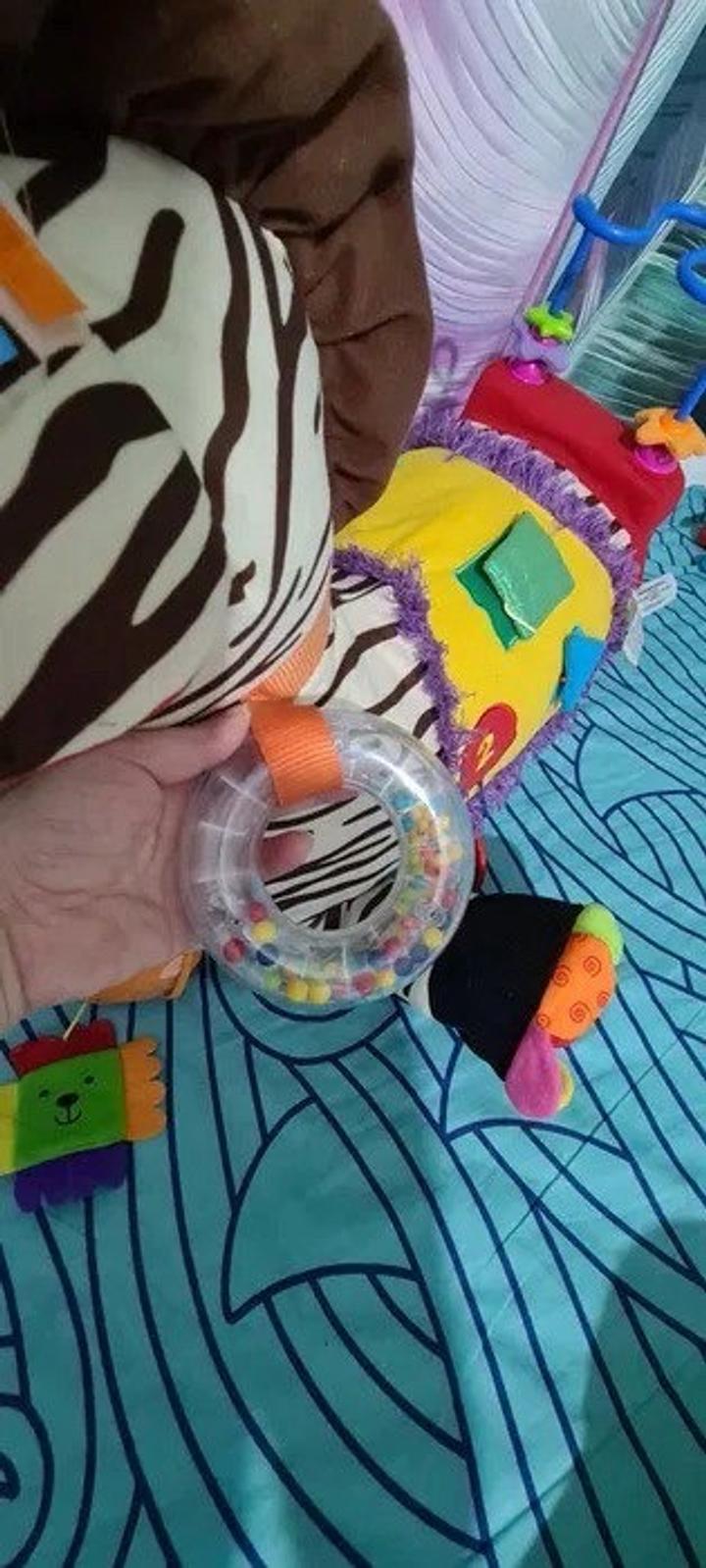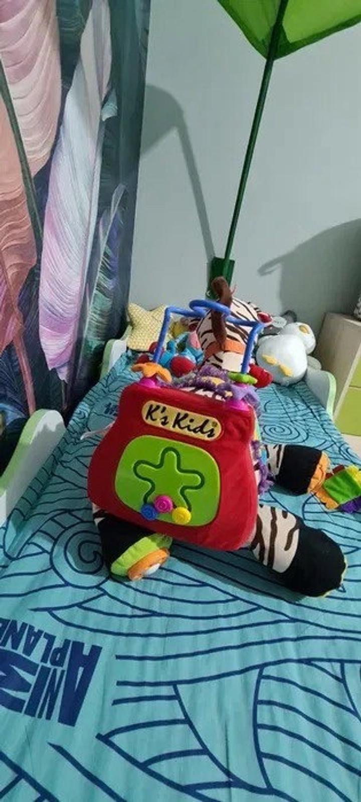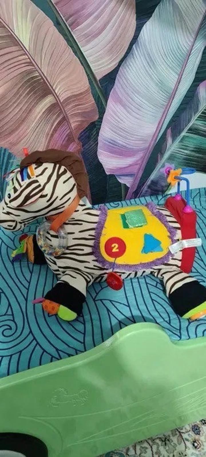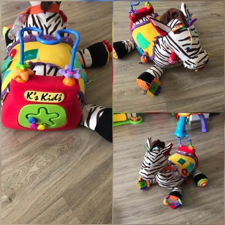 Набор ""Зебра 28" – это мягкий игровой модуль компании K'S Kids, включающий в себя всевозможные игровые и развивающие элементы. Содержит 28 активных элементов, среди которых есть погремушки, шуршалки, трещалки, пищалки, кармашки с прячущимися в них предметами. Игрушкой можно шуршать, греметь, перебирать пальчиками, на нее можно даже сесть. При изготовлении зебры применялись разнообразные виды ткани и пластика. Голова лошадки содержит множество игровых элементов. Покупали за 25 000 тг. Артикул: 497510