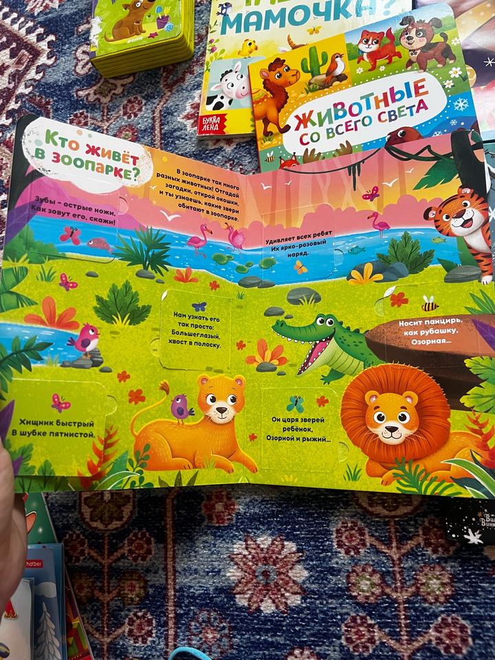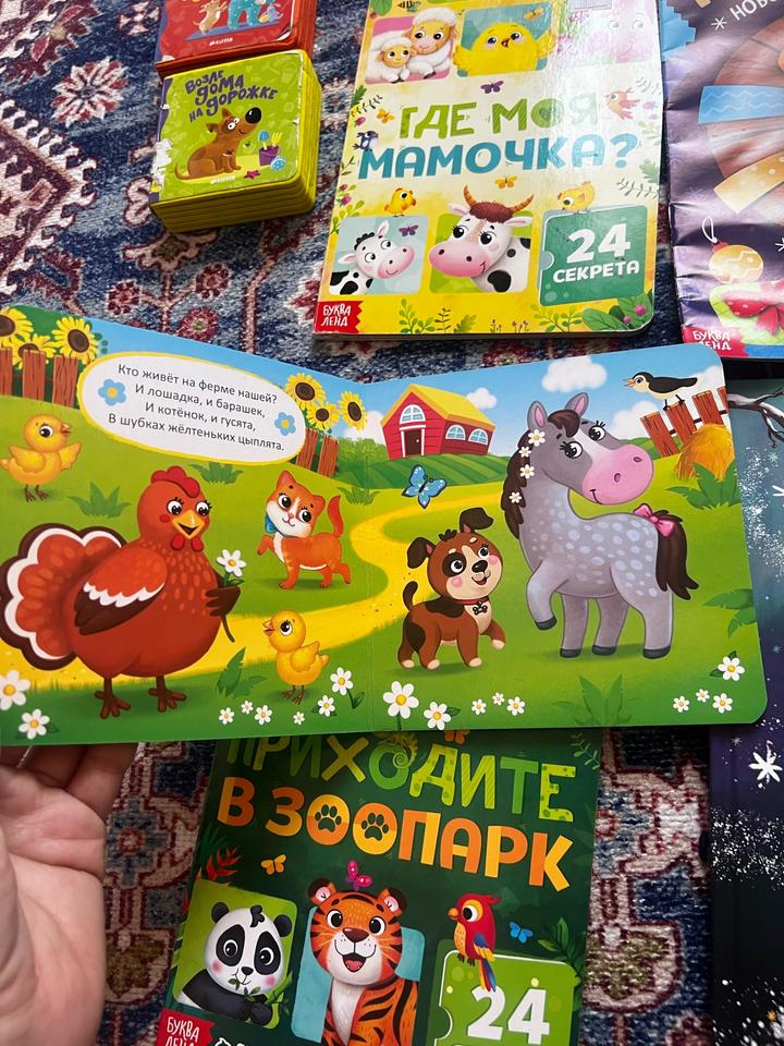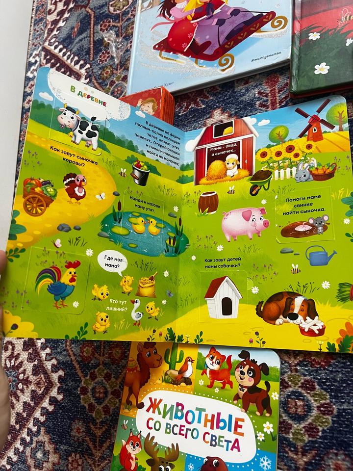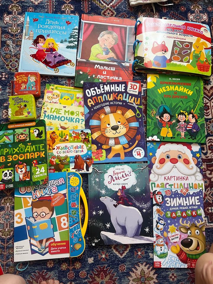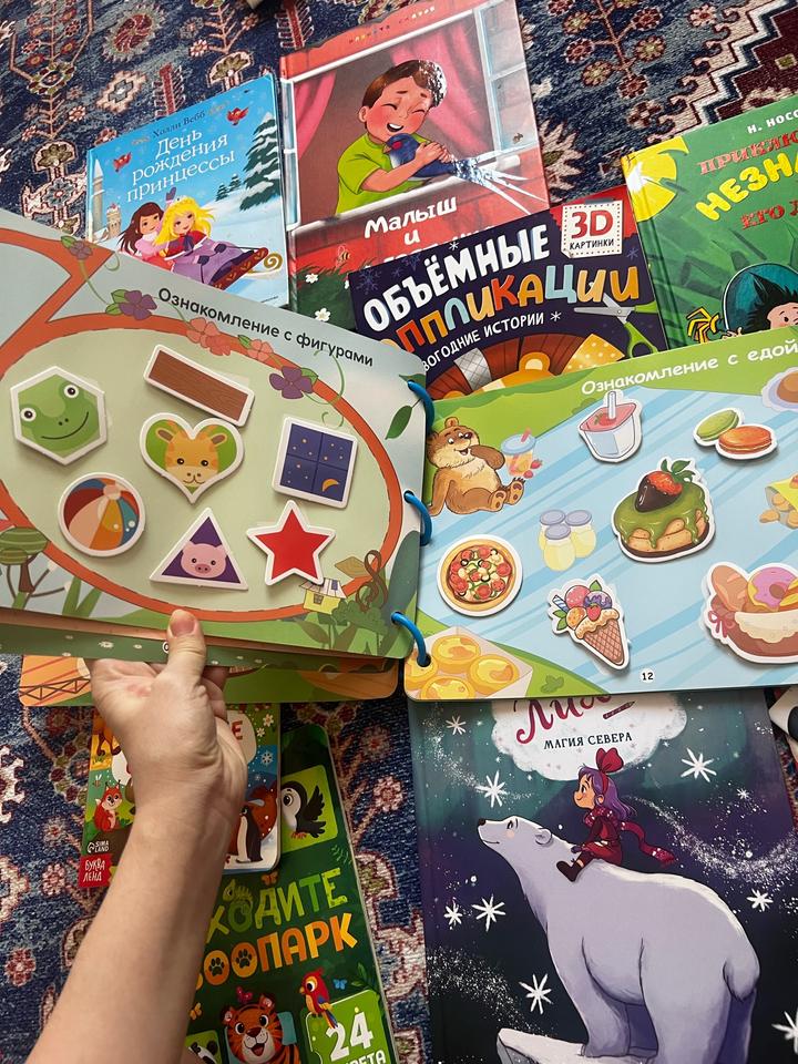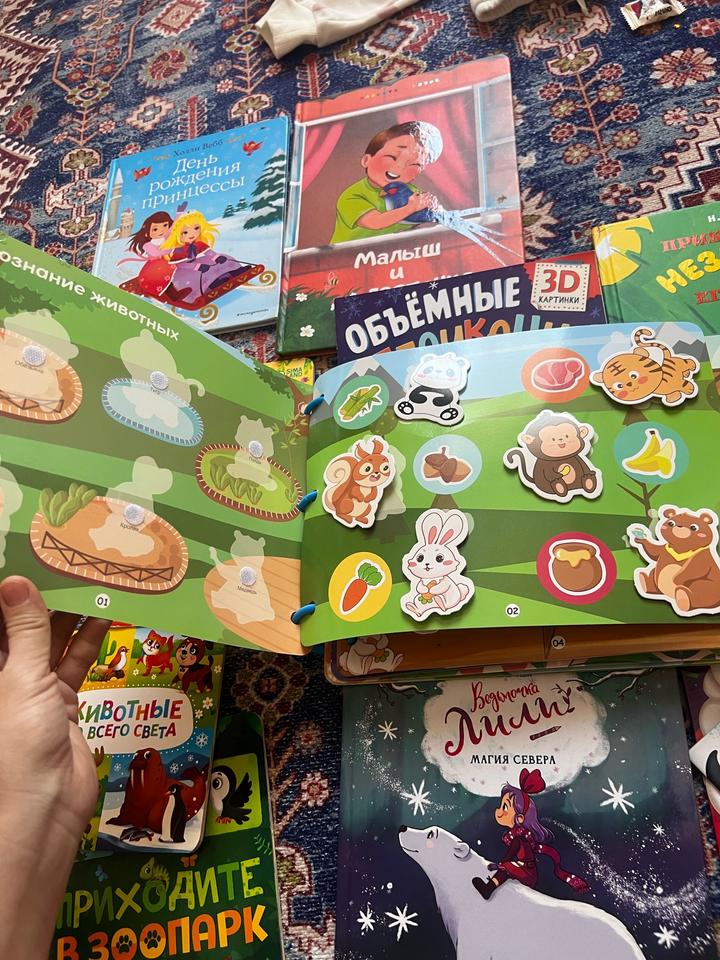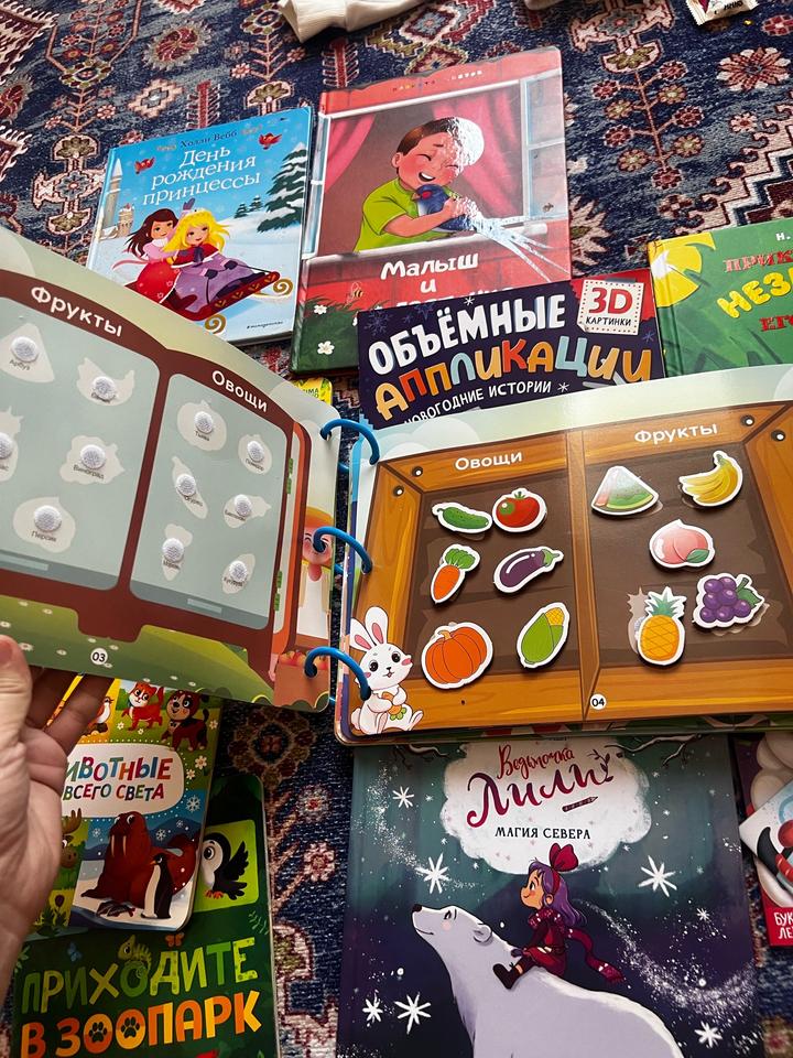 1. День рождения принцессы - добрый рассказ о случившемся волшебстве 2. Малыш и ласточка - в книге 3 народные казахские сказки на русском 3. Развлекательная книжка с наклейками - развивающая книга с множеством заданий на липучках 4. «Встало солнышко с утра» и «Возле дома на дорожке» - маленькие книги с твердыми страницами со стишками и картинками 5. «Где моя мамочка?» и «Приходите в зоопарк» - книжки с открывающимися окошками остальное все не помещается в описание( все за 10 тыс тенге Артикул: 498330
