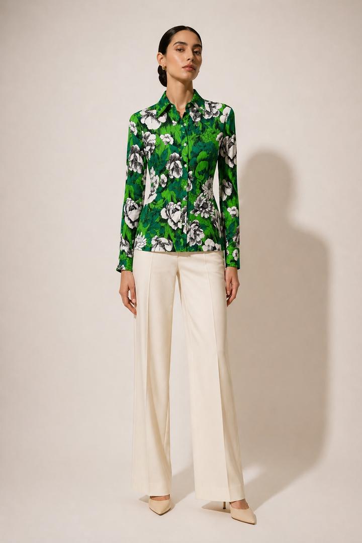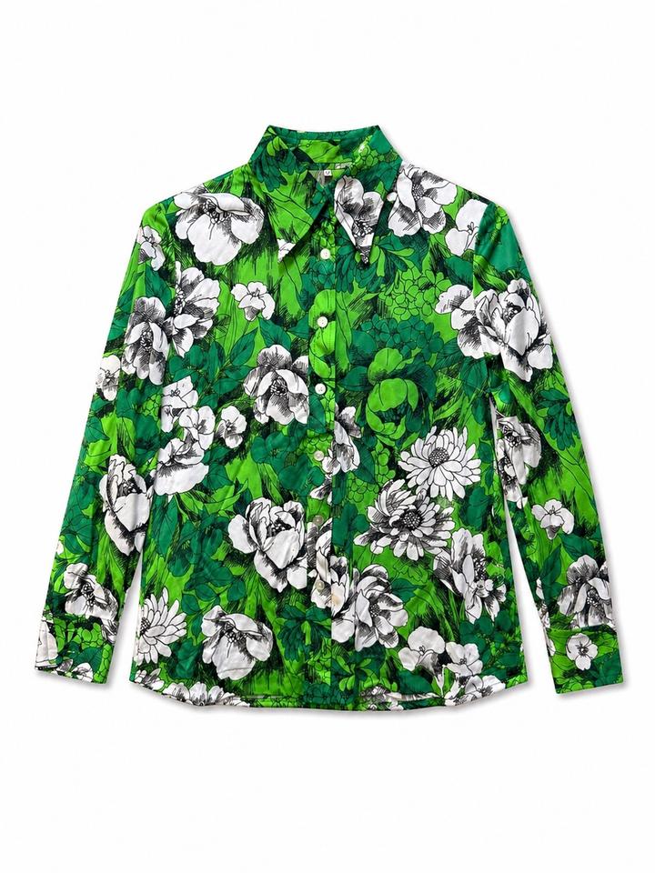Легкая блуза с ярким зелёным фоном и крупным цветочным принтом в бело-чёрной графике. Модель с классическим воротником и длинными рукавами выглядит выразительно и свежо. Мягкая, тянется, приятная к телу . Артикул: 499720