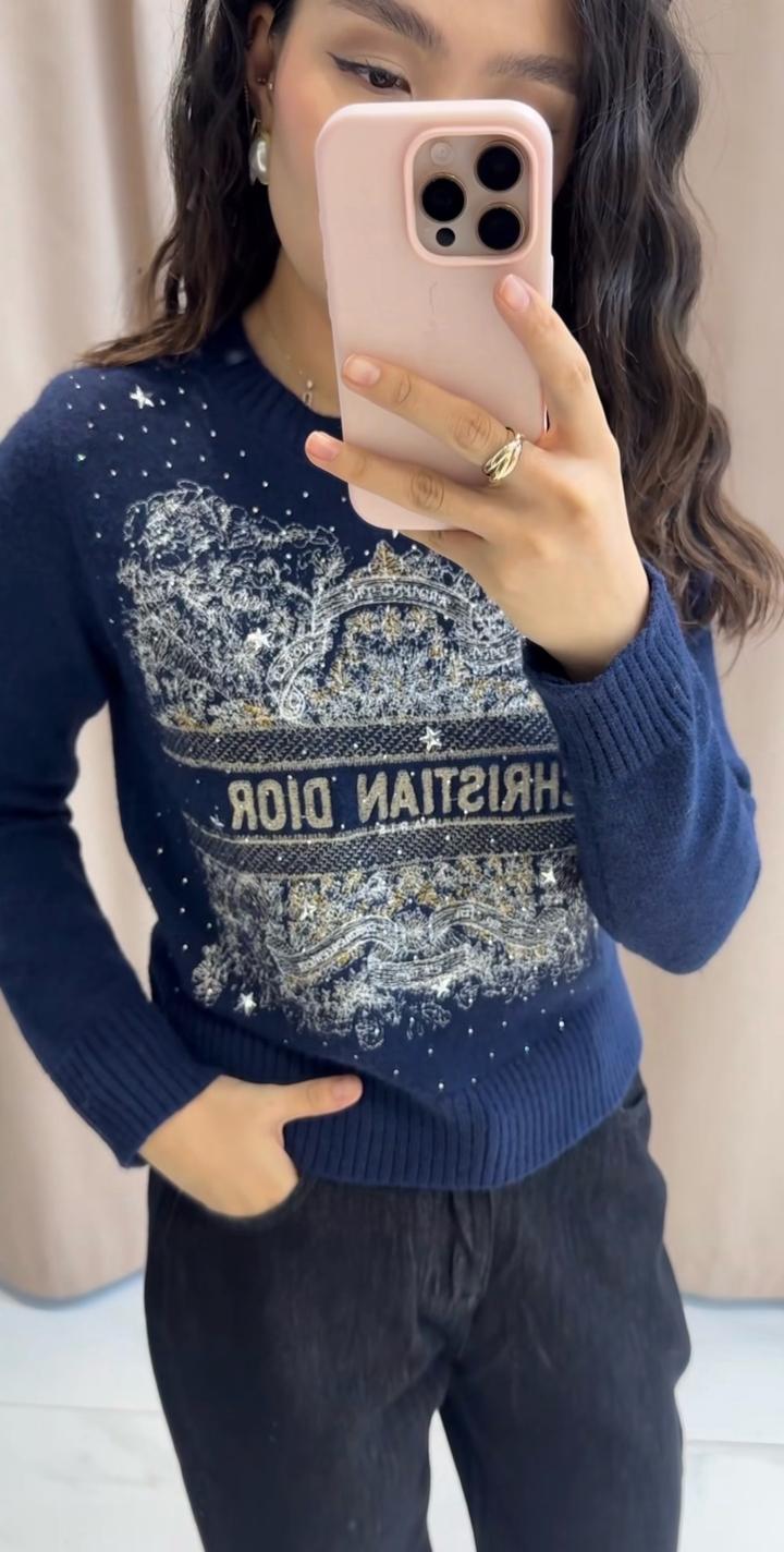 Новый качественный свитер под диор Качество супер, никаких катышек не выйдет Все элементы и стразы на месте, смотрится очень эффектно и красиво 🙌 Длина идеальная, можно не заправлять что очень удобно. Размер стандарт. Покупала за 20к, Состояние отличное носила 1 раз Артикул: 500268