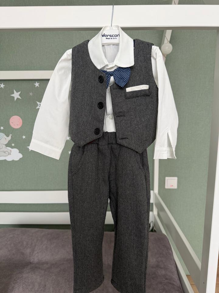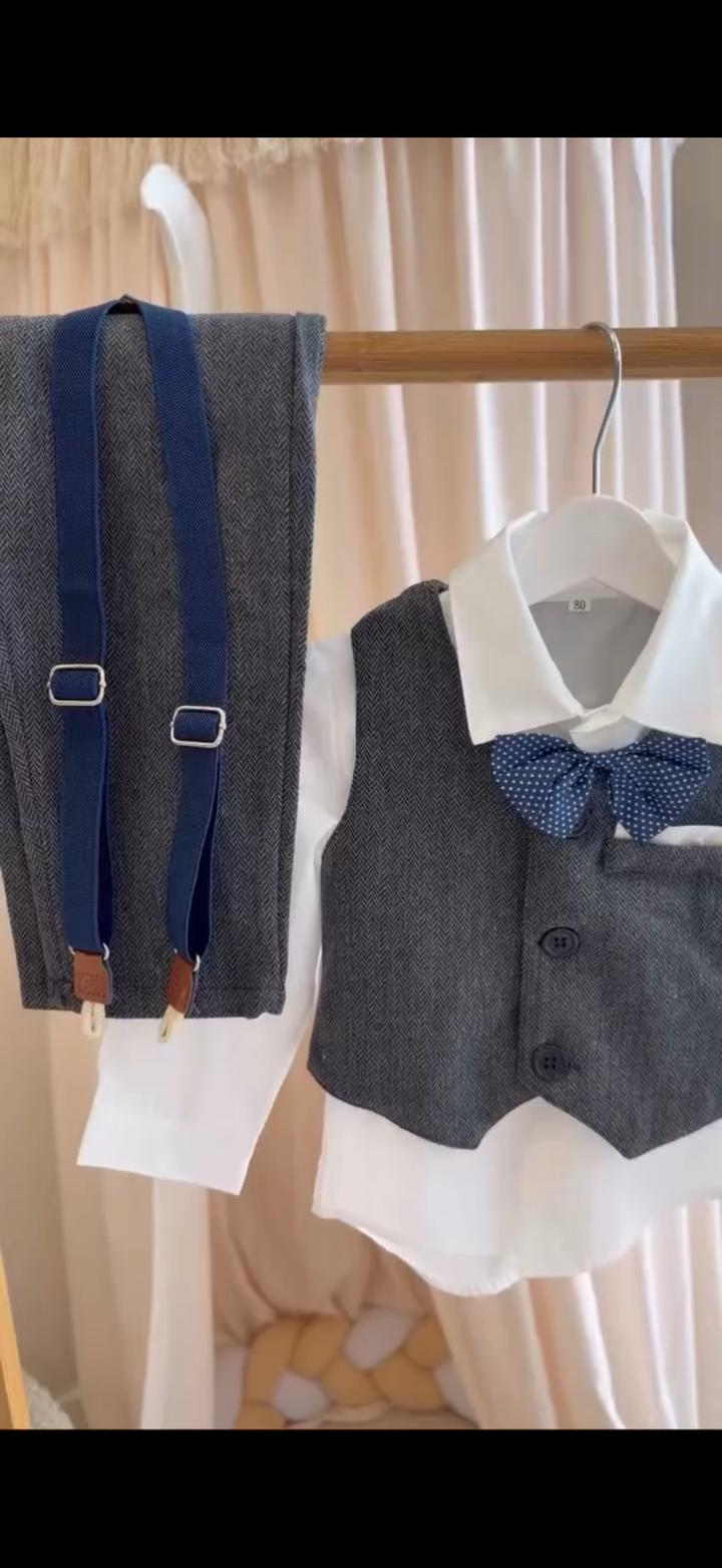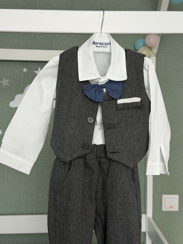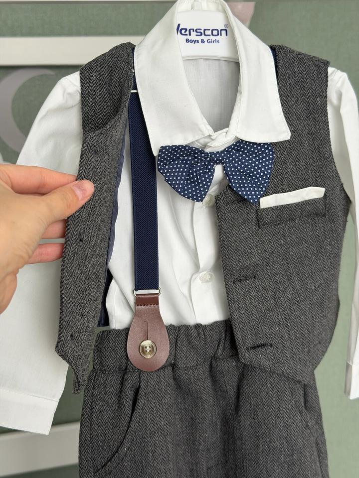 Абсолютно новый костюм тройка с подтяжками для мальчика, на годик идеально , размер 80-86, покупали лишь для фотосессии на 30 минут. Очень качественный костюм , красивый, милейший образ для мальчика Артикул: 500452
