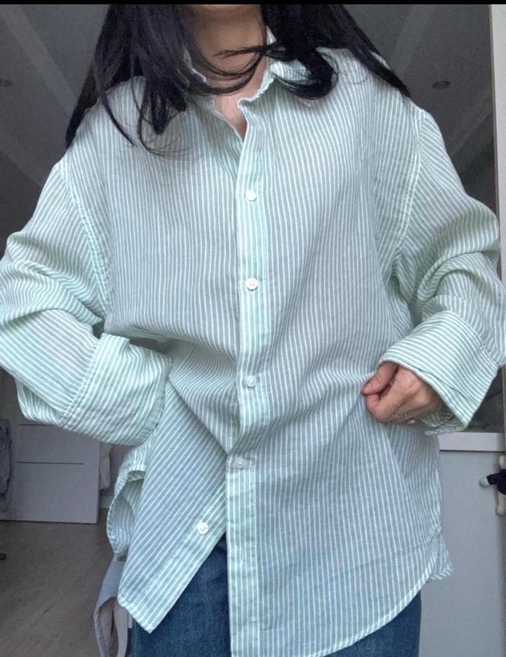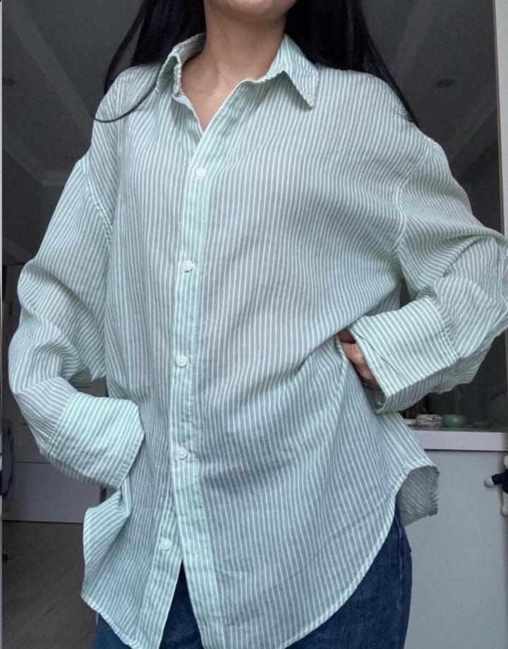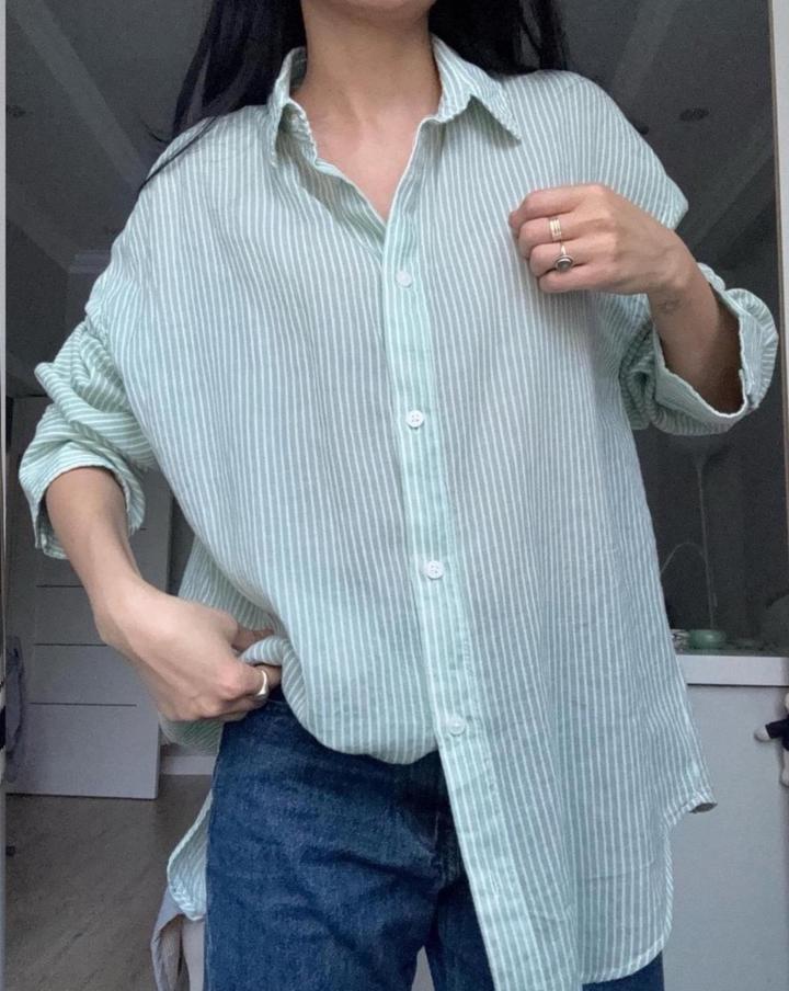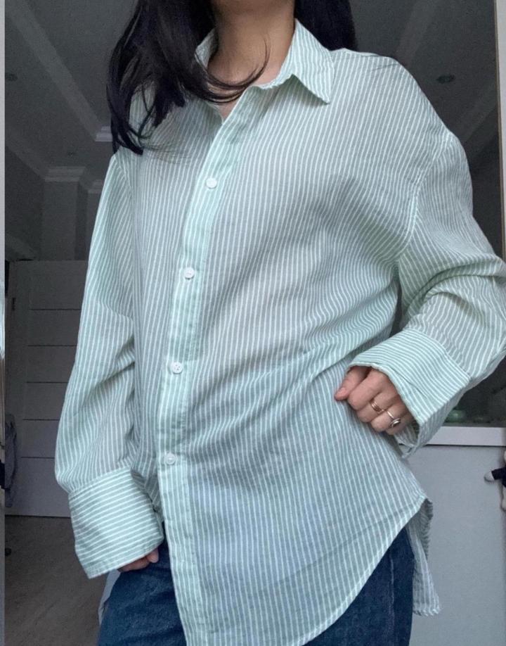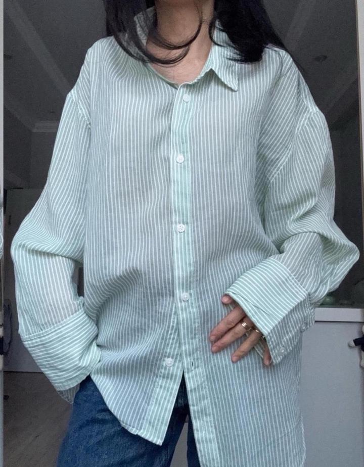Рубашка свободного, оверсайз-кроя в тонкую вертикальную полоску нежно-мятного цвета. Лёгкая, комфортная. В отличном состоянии. Артикул: 500514