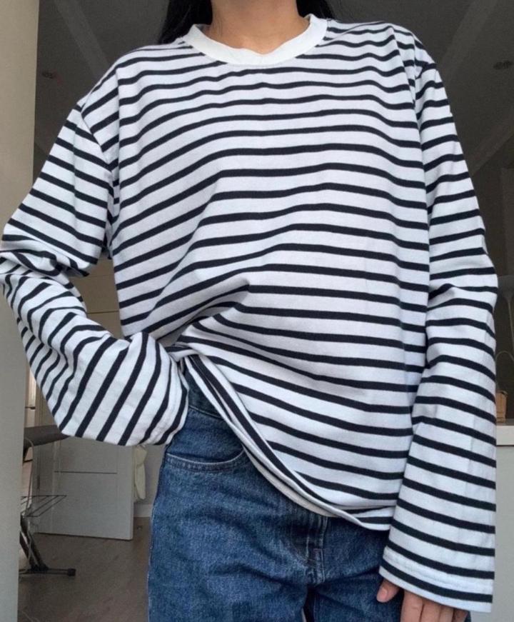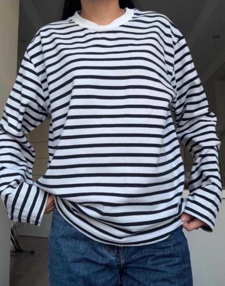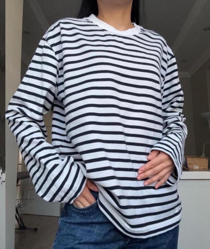 Лонгслив оверсайз от LIME из плотного хлопкового джерси в контрастную полоску. Круглый вырез. В отличном состоянии. Размер XS, но подойдет для S. Артикул: 500559