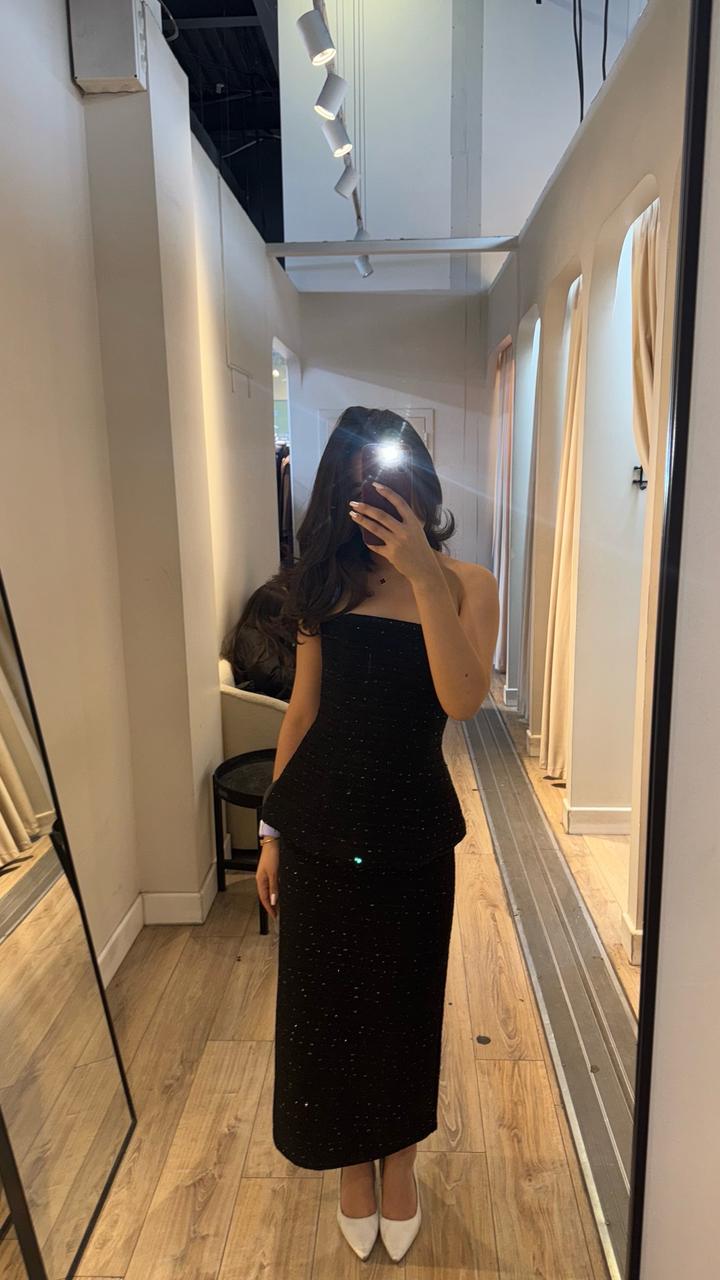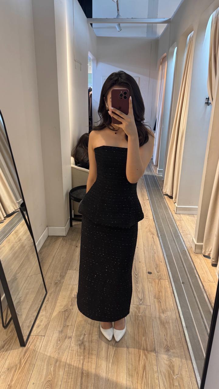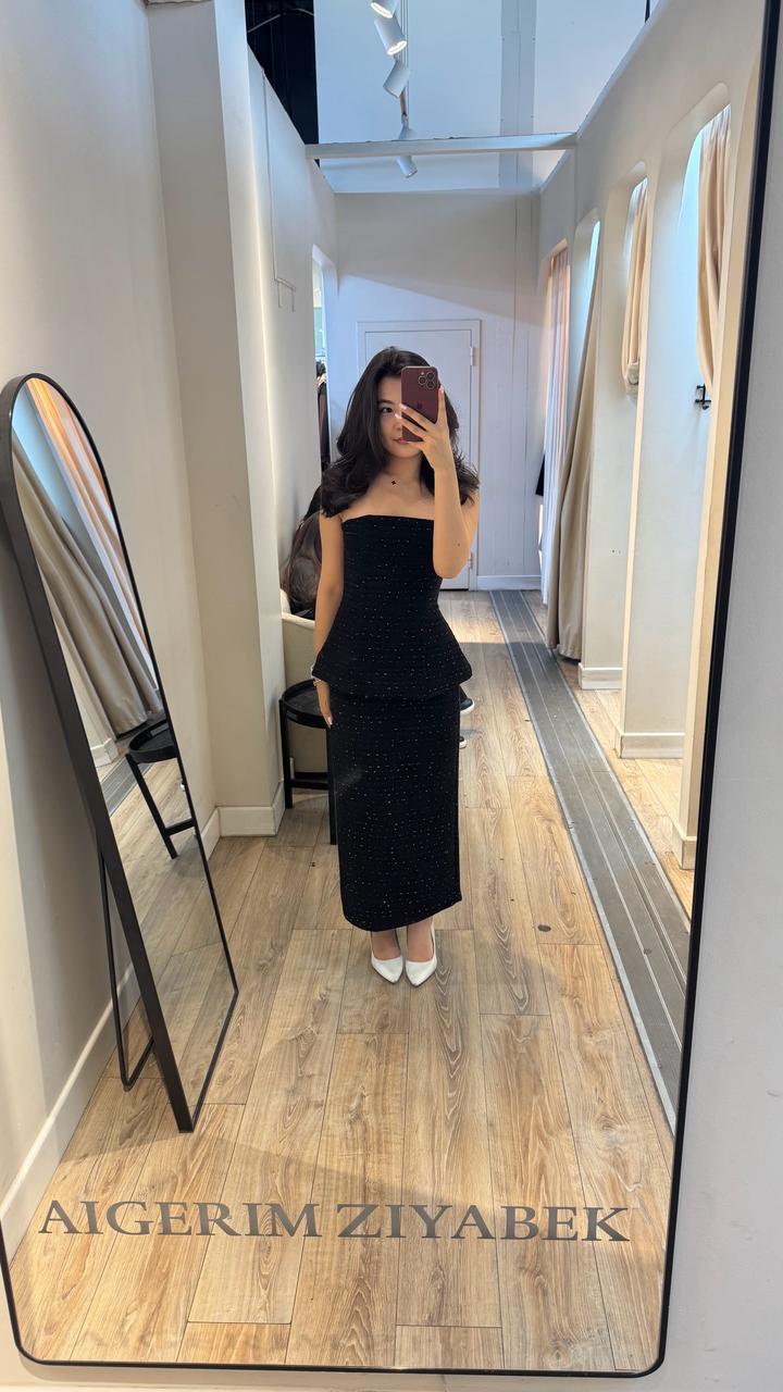 Черная твидовая двойка. Плотный материал, очень хорошо держится и скрывает все недостатки. Купила и только 1 раз одевала Размер: 42-44 Артикул: 500742