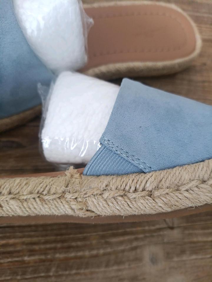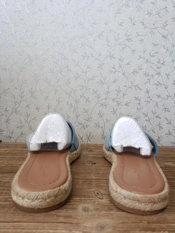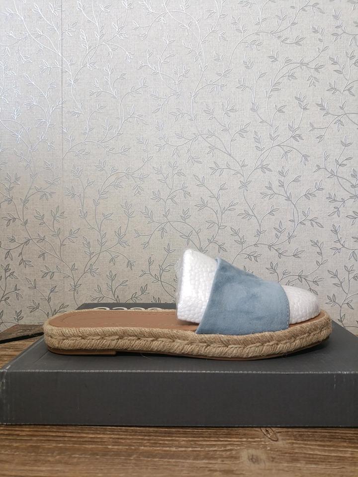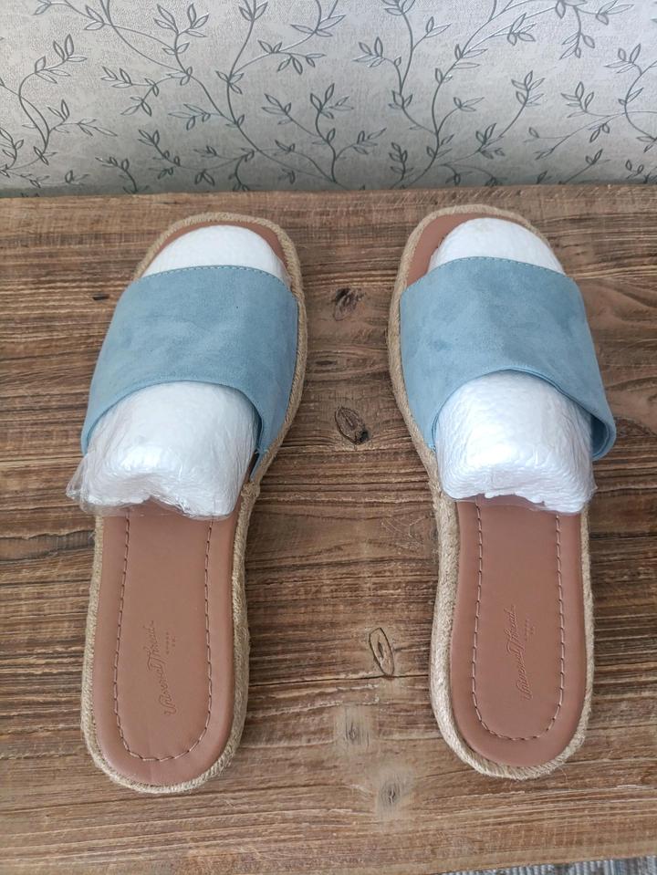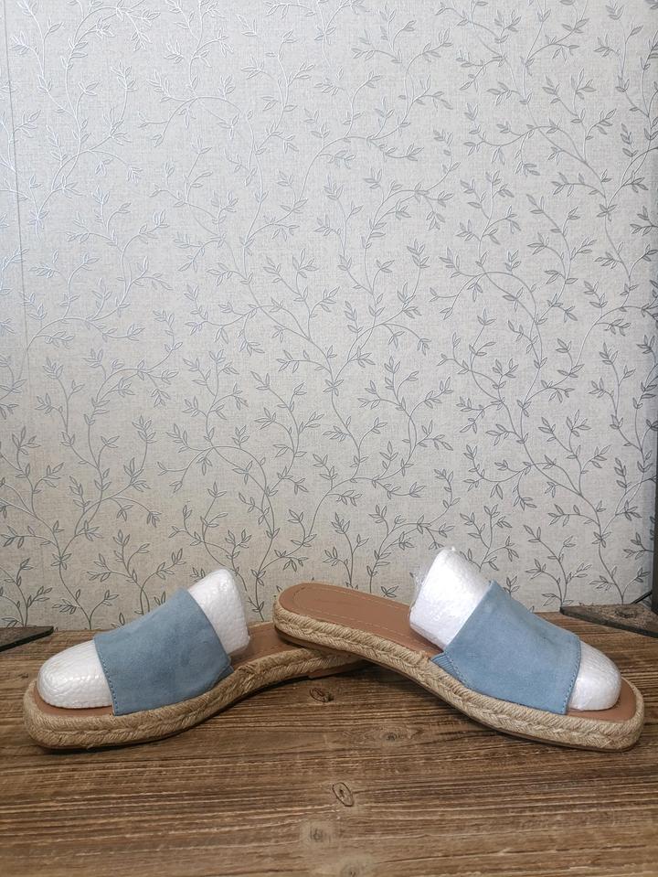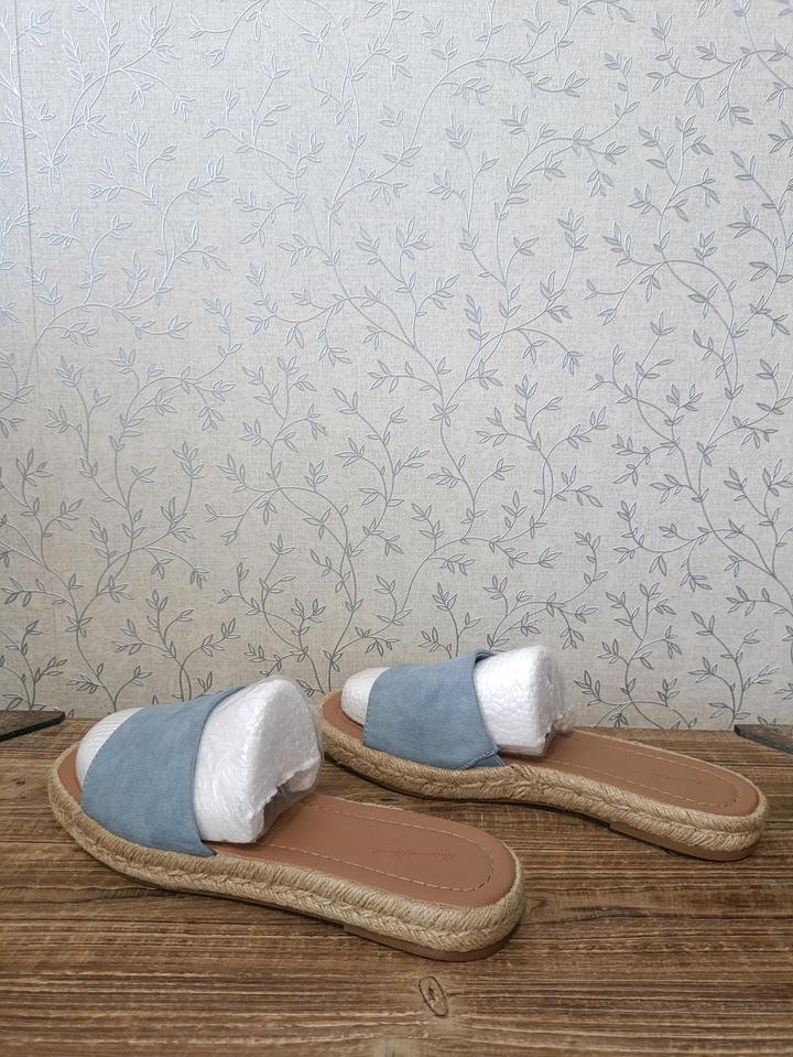Женские сандалии-мюли Maren от бренда Universal Thread. Шлепанцы (слайды) в стиле эспадрилий. Широкий ремешок из мягкой эко-замши голубого цвета. Открытый квадратный носок. Подошва с плетеным джутовым кантом по краям. Стелька выполнена из мягкой эко-кожи. Артикул: 500774