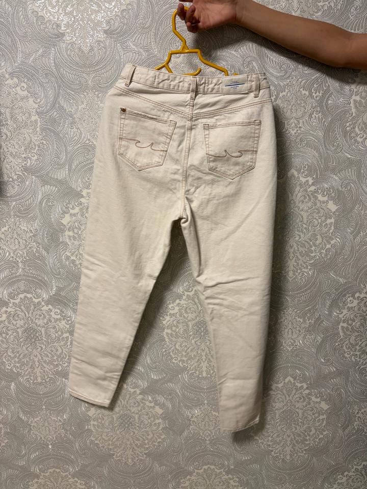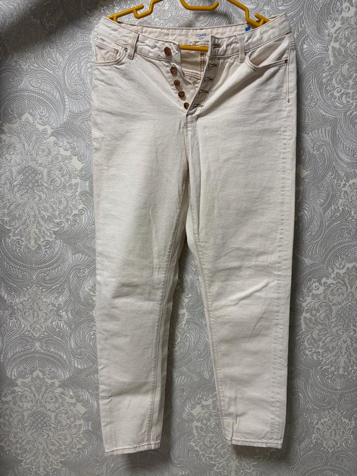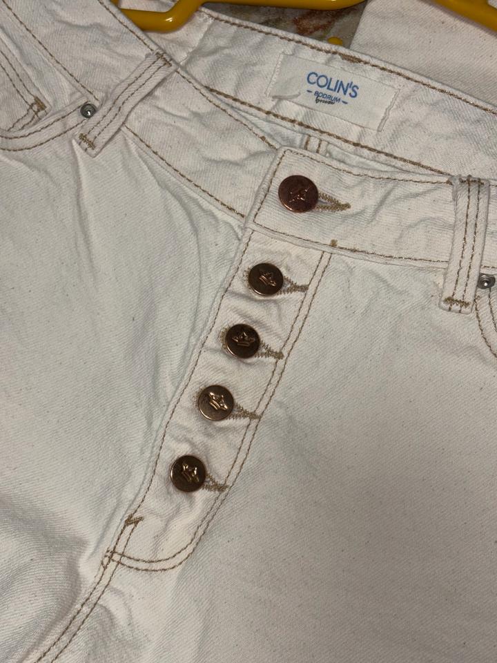 Джинсы COLIN’S (Bodrum) — MOM FIT Тип: женские джинсы Бренд: Colin’s Цвет: молочный / кремово-белый (off-white) Материал: плотный хлопковый деним Посадка: средняя (mid-rise) Крой: зауженные ⸻ Конструктивные особенности • Застёжка: ряд из 5 металлических пуговиц (button fly) бронзового цвета. • Классическая джинсовая конструкция: • 2 передних кармана • маленький coin-карман • шлёвки для ремня • Контрастная строчка коричневого Артикул: 501459