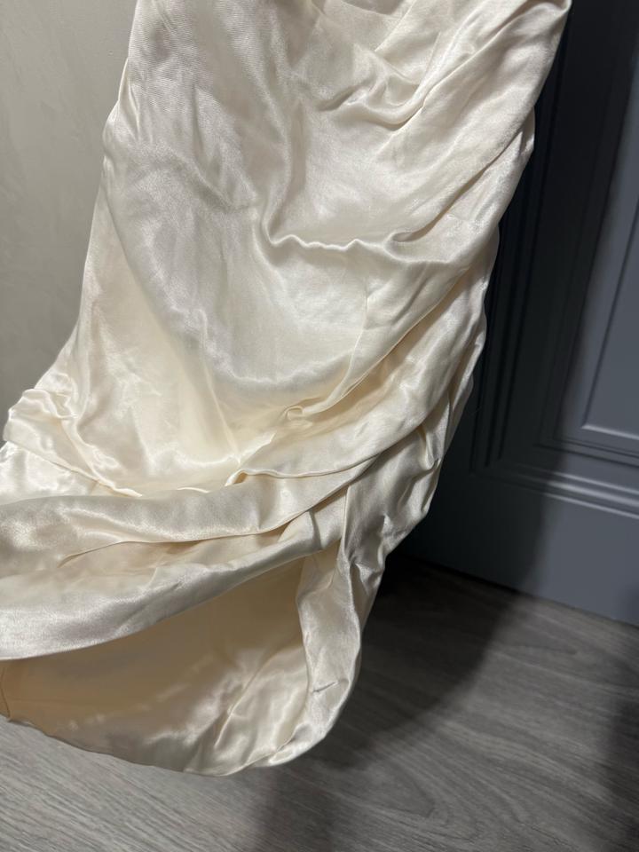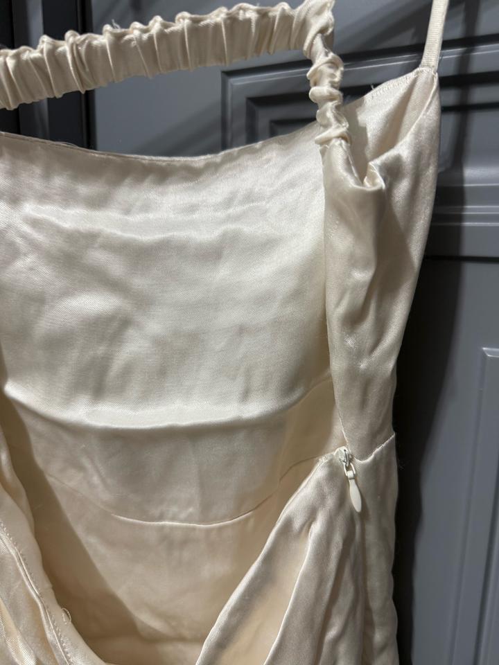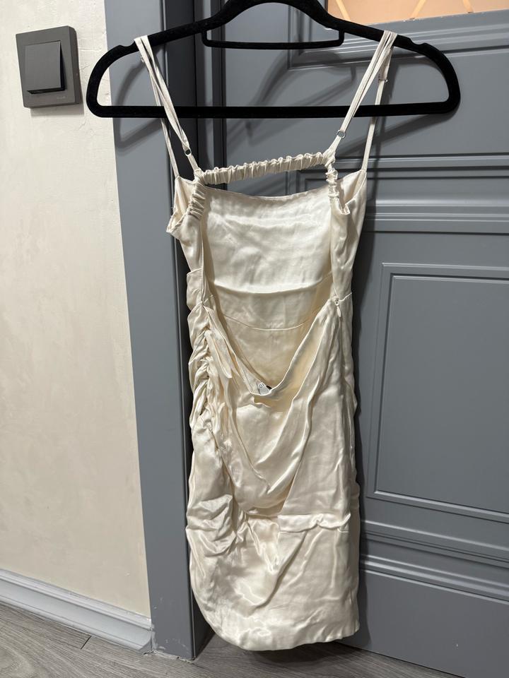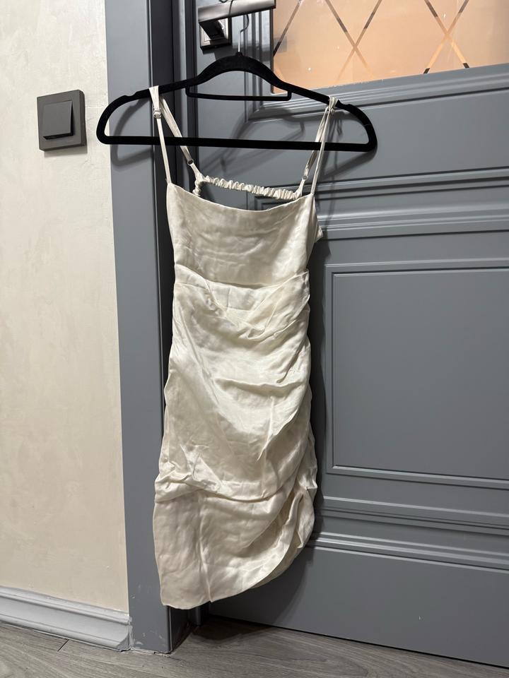 Размер xs, материал похож на атлас. Не одевалась, но этикетки нет. Если подогнуть можно носить как топ. Сбоку есть замок, спина открытая Артикул: 501744