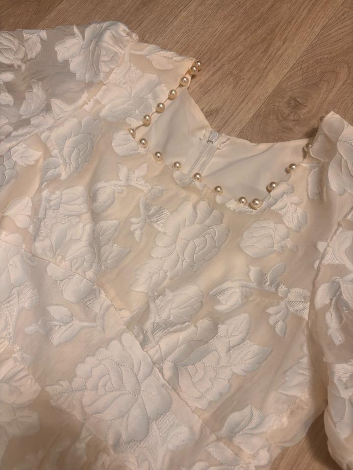Нежное белое платье длины до колена с красивой текстурной вышивкой. Модель с квадратным вырезом и короткими объемными рукавами-фонариками.Сшито на заказ.Размер S-M. Надевала только один раз на мероприятие. Артикул: 501833