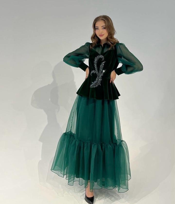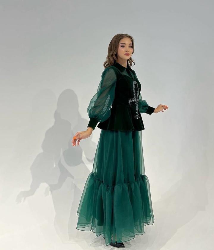 Нежная двойка на любые праздники в роскошном изумрудном цвете Ткань чуть плотнее органзы, хорошо держит форму. Накидка Бархат, с ручной вышивкой Носили 1 раз, в отличном состоянии Артикул: 502182