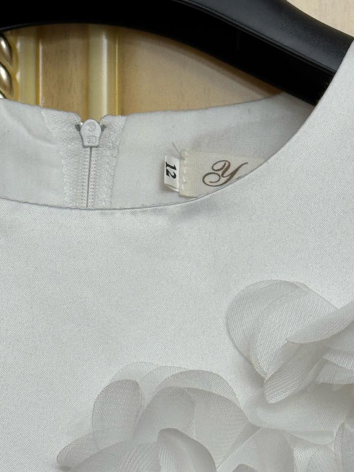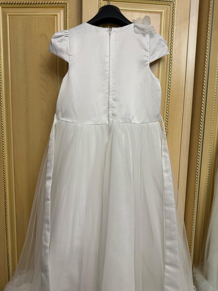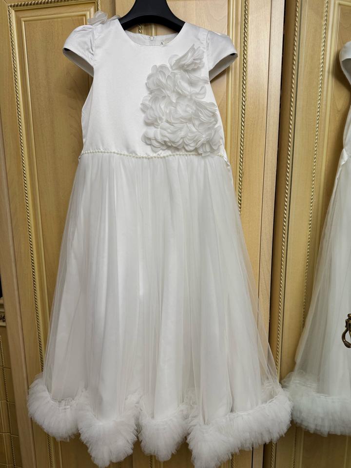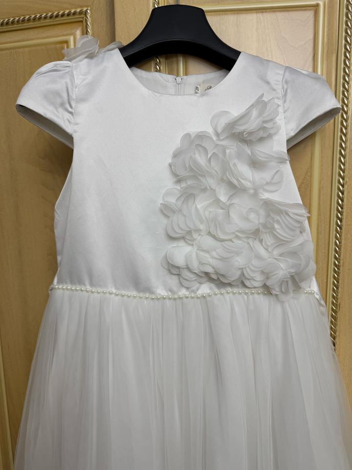 Белое бальное платье. Очень красивое. В идельаном состоянии. Одевалось 1 раз на 25 мая. На этикетке размер написан 12. Моя доча одевала в возрасте 8 лет. Артикул: 502615