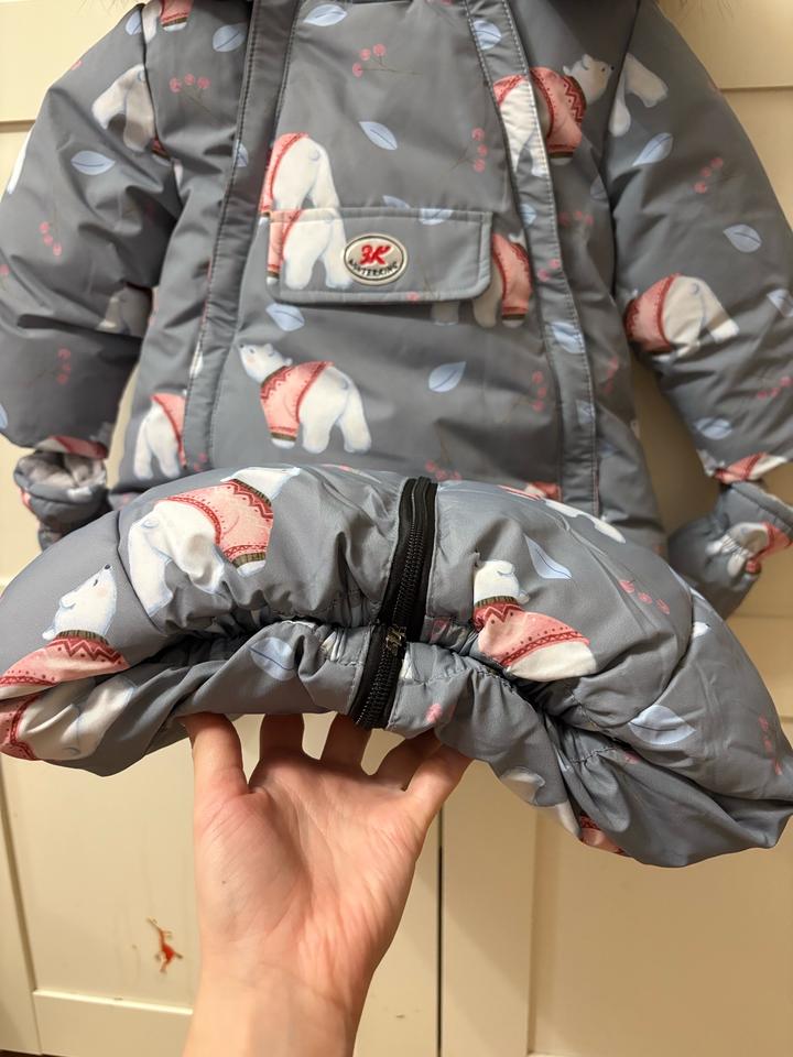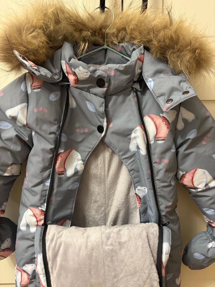 Зимний комбинезон, в комплекте пинетки и рукавички. Мех и капюшон по необходимости отстегивается. Подклад - флис. Можно перестегнуть в конверт. Рост до 80. Артикул: 502894