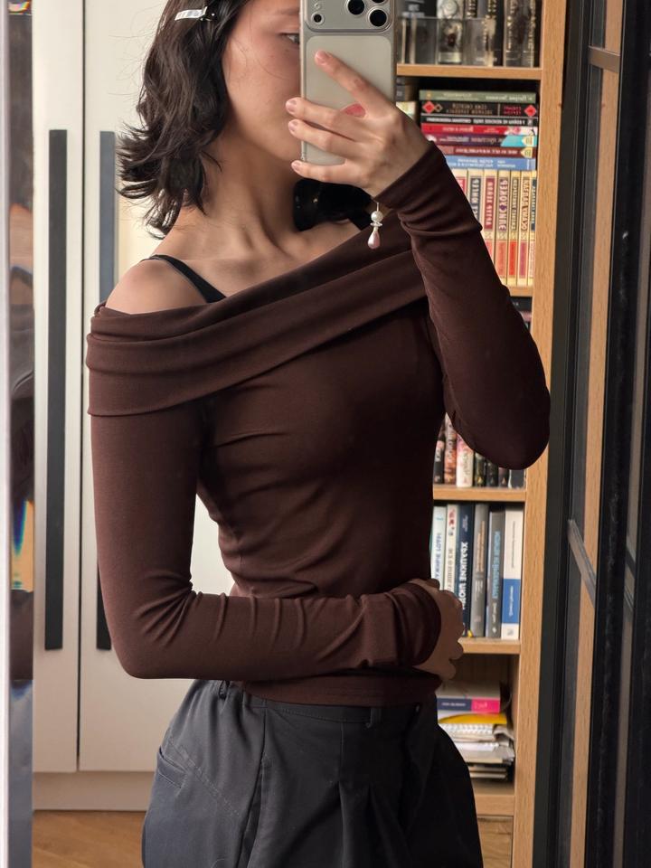 Коричневый топ со спущенными плечамиS