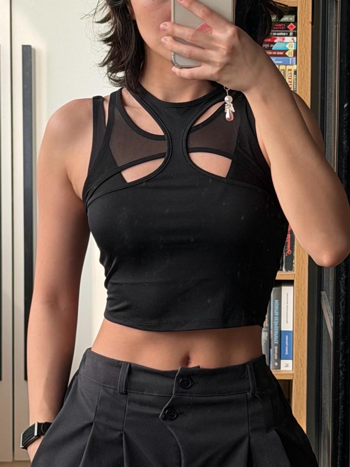 Черный топ с вырезами и сетчатыми вставкамиXS