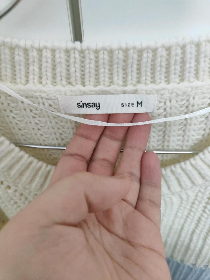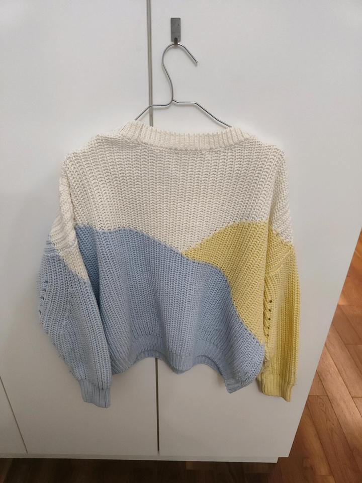 Свитер трехцветный: белый/голубой/жёлтый Очень удобный, но уже растянувшийся. Особых повреждений на нем нет, очень удобный. Артикул: 503412