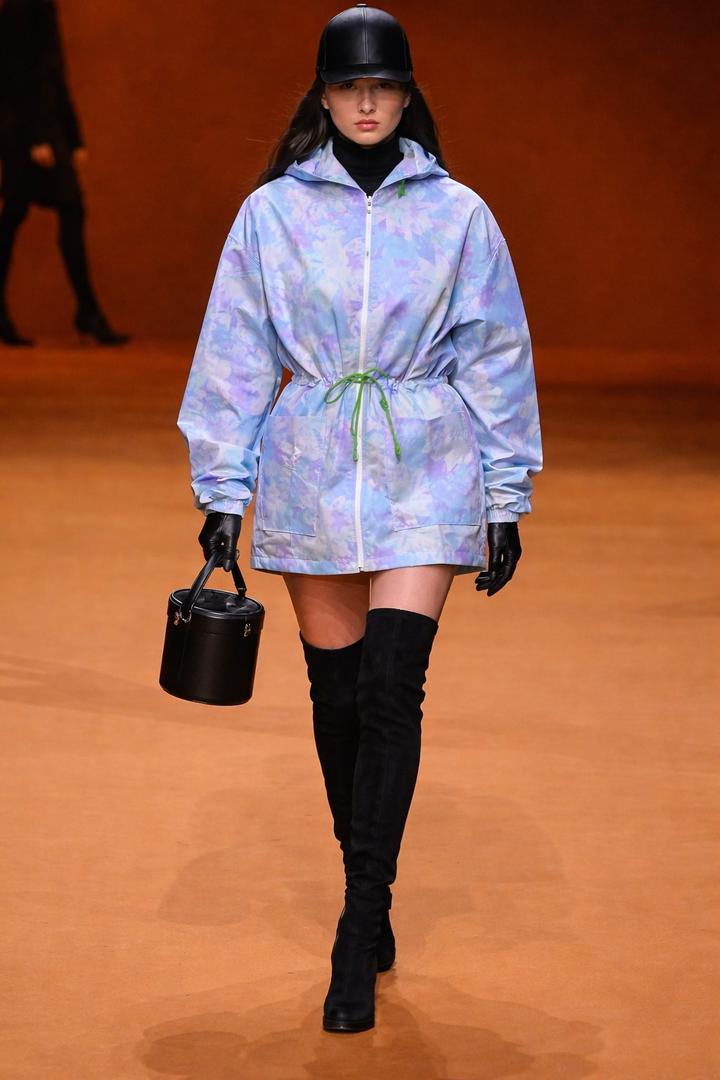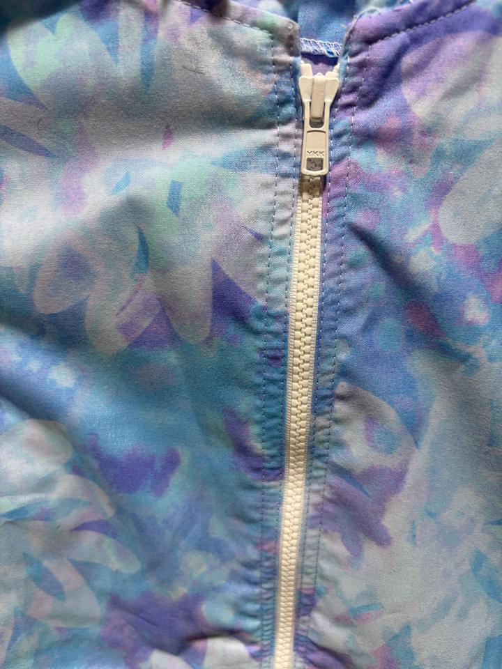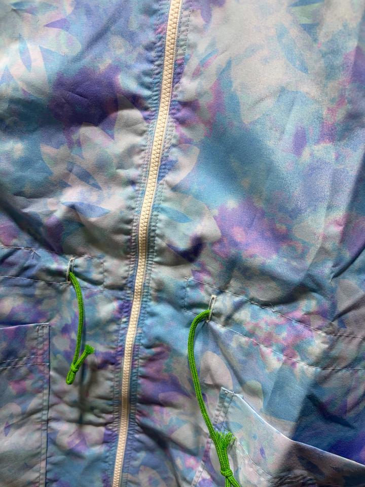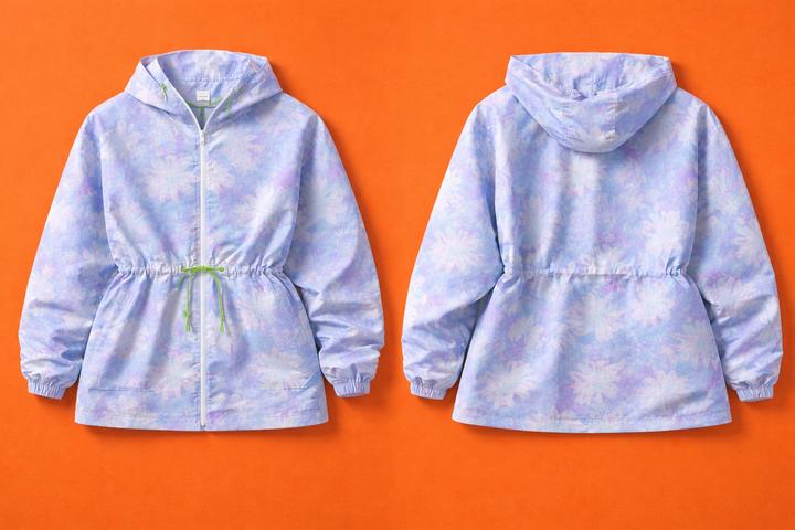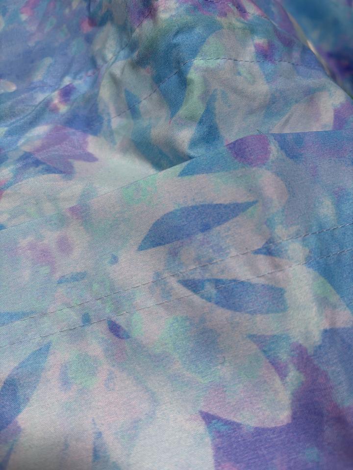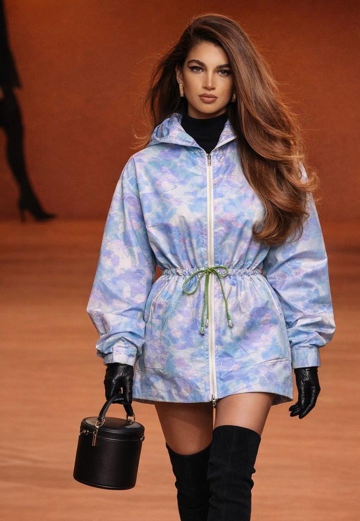 Лёгкая ветровка в нежном ю цветочным принтом в пастельных голубых и лавандовых оттенках. Свободный силуэт с капюшоном и регулируемой кулиской на талии. Артикул: 503460