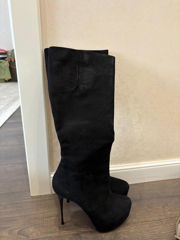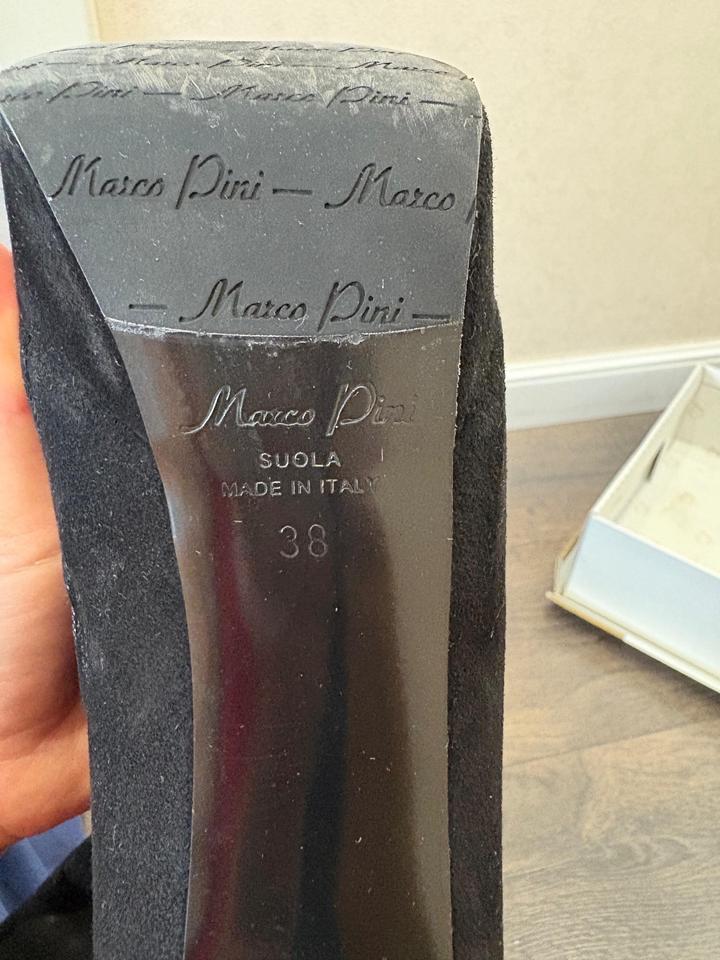 Продам итальянские замшевые черные сапоги Marco pini . Высота каблуков 10 см, размер 39, колодка очень удобная. Внутри имеется мех,очень теплый, носила пару раз на мероприятия. Европейка. Артикул: 503510