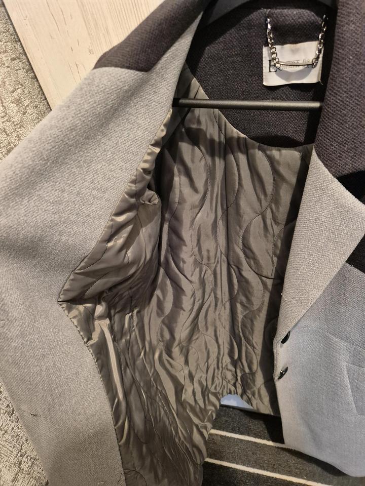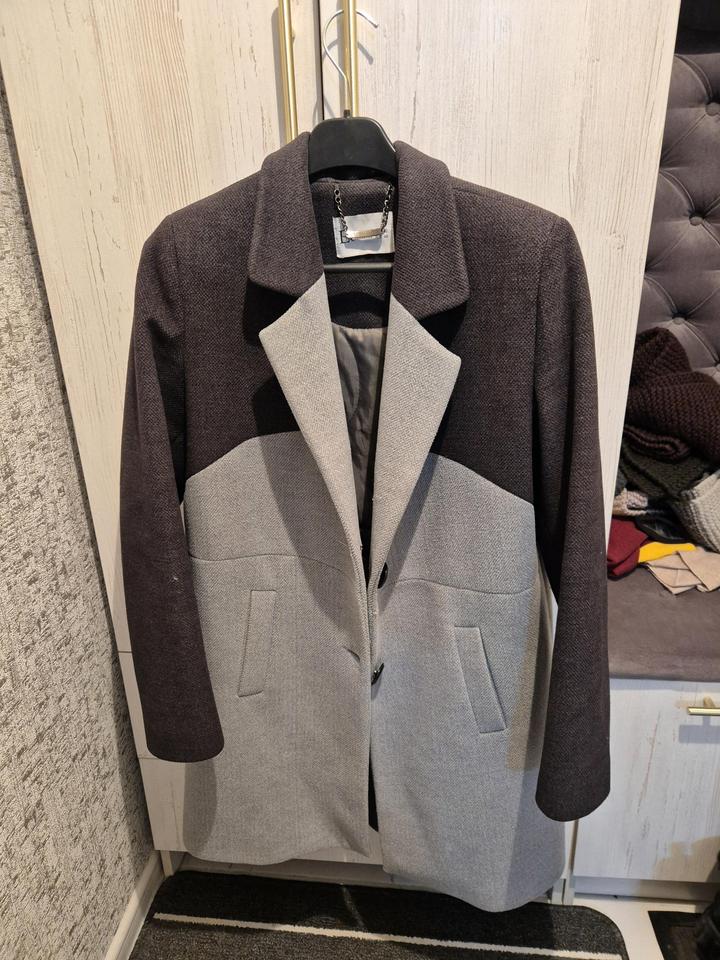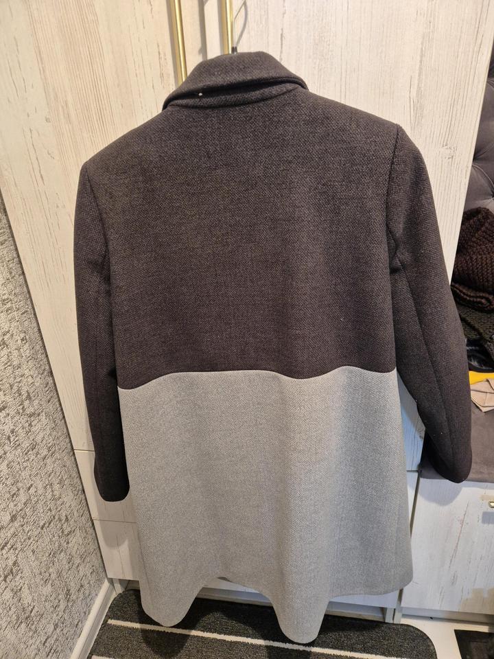 Двухцветное пальто. Цвета: темно и светло серый. Длина средняя. Очень тёплая. Хорошего качества. Плечики прямые Артикул: 503679