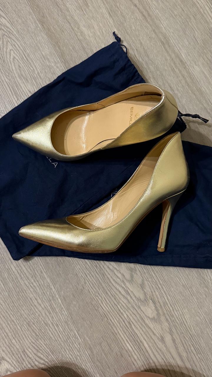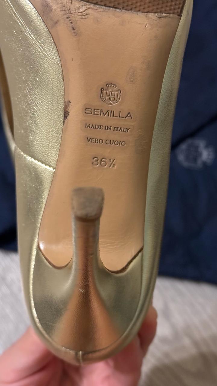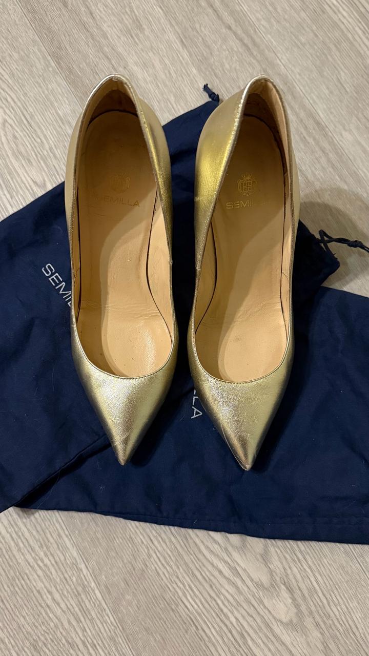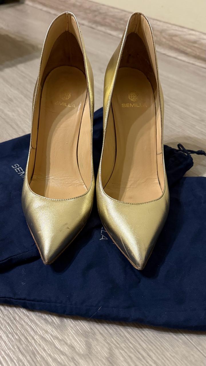 Кожаные туфли золотистого цвета итальянского бренда Semilla, на высокой шпильке и высоким задником, для утонченности и придания более вечернего образа Размер 36,5 Имеются пыльники Артикул: 503760